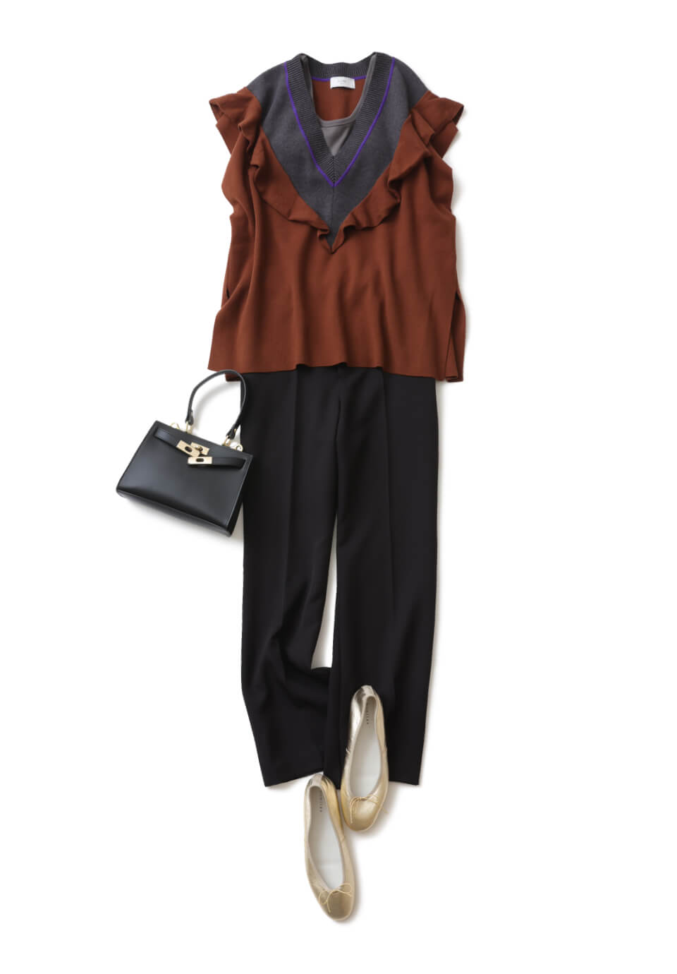 この秋トレンドのベストは、ベーシックなものに加えて映えるデザインを1枚持っておくと便利。レイヤードが少ない今の時期こそ、一点投入でサマになって本領を発揮!パープルのラインがアクセントのチルデンベストにフリルをあしらうことで、シンプルなパンツコーデをぐっとフェミニンな印象にシフト。