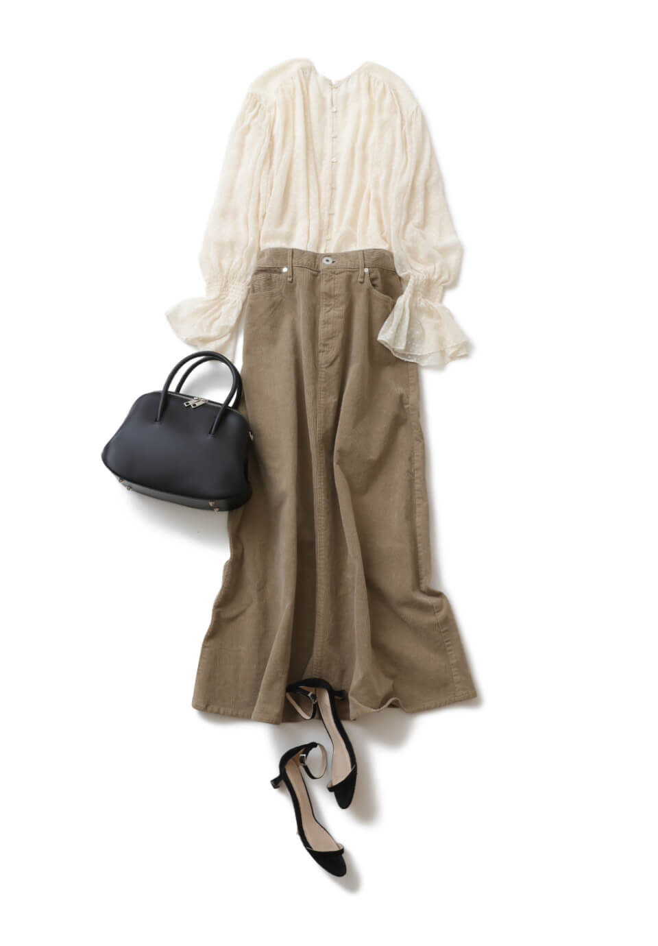 大人リラクシーなギャザーブラウスに、コーデュロイのベージュスカートをつないで秋のムードを漂わせて。透け感のある素材なら暑苦しくなく、簡単に秋コーデを楽しめておすすめ。リュクスなブラックのボストンバッグとストラップサンダルは黒でまとめて、キレイめに仕上げて。