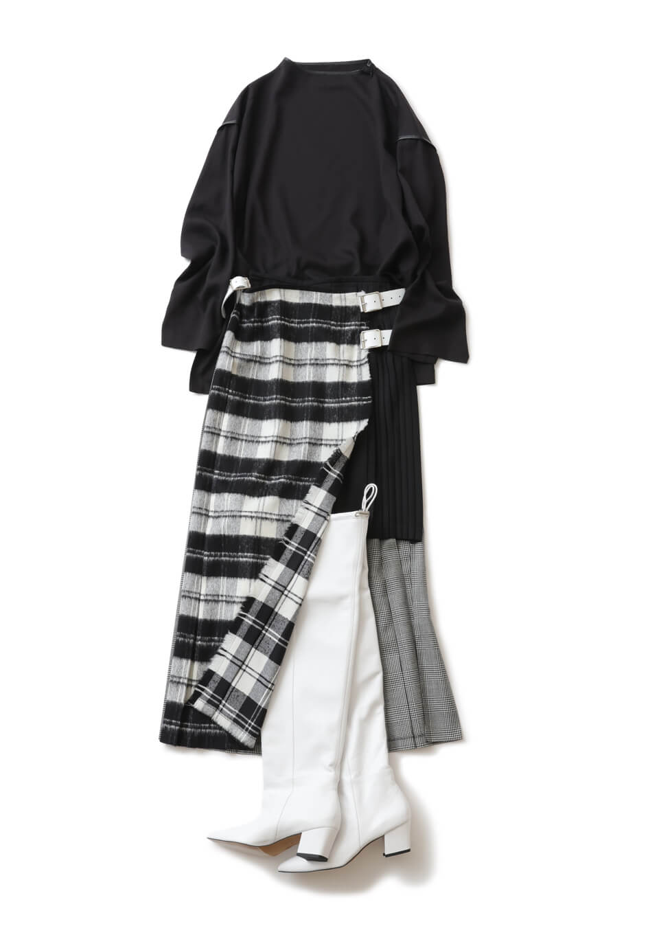黒ブラウスをラフにブラウジングしたのは、存在感たっぷりのチェックスカート。ロングとミニ、異なるチェック柄を組み合わせたエッジィなデザインで、唯一無二のスカートコーデを完成させて。サイドから白ブーツをチラ見せして、さらにモードを楽しみたい。