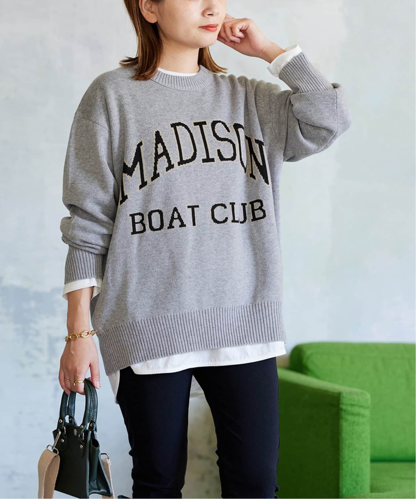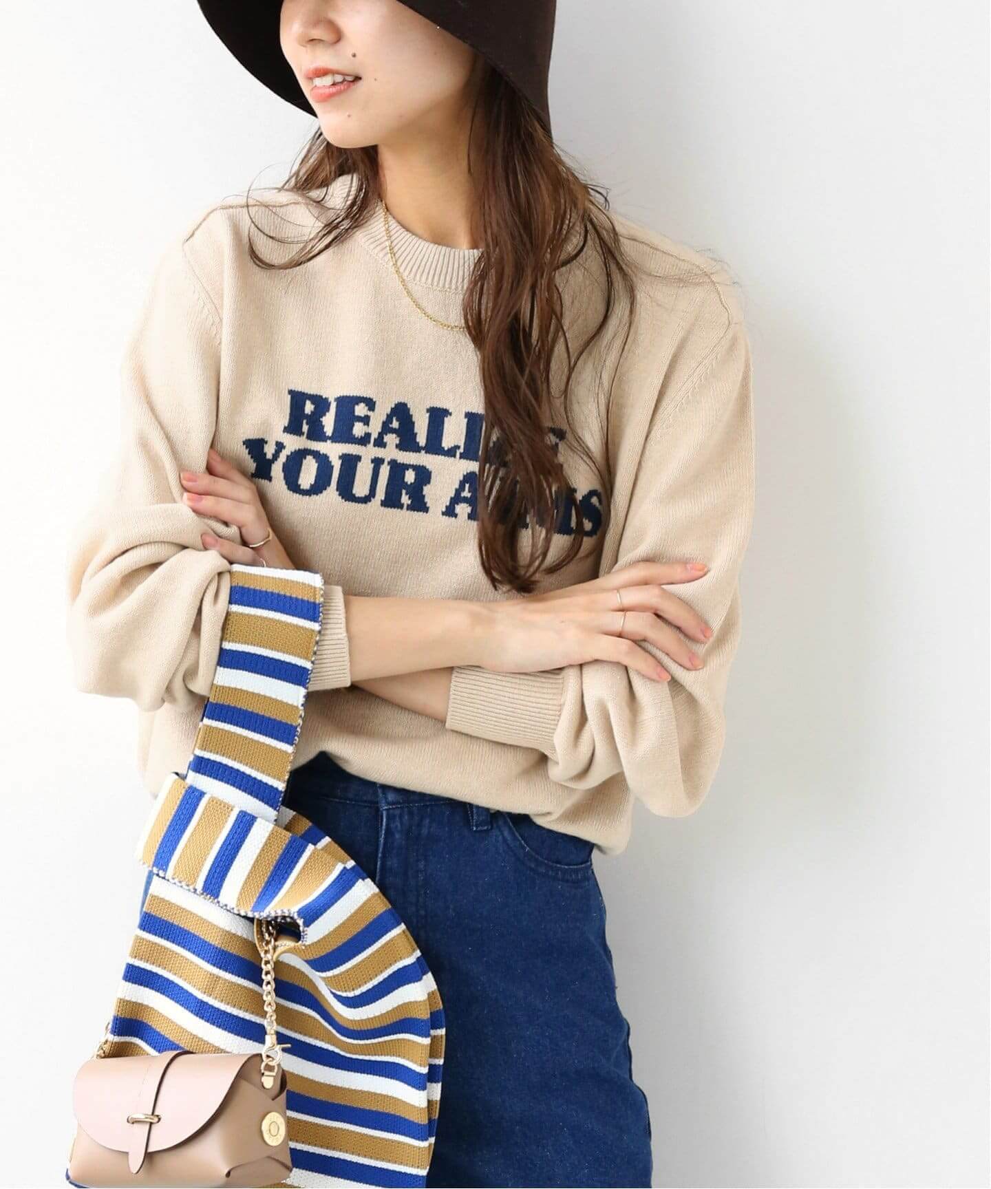 ラフさと上質感がちょうどいい!カジュアルになりすぎず大人っぽく仕上がるロゴ入りのニット。ロゴがアクセントに効いて、秋冬のワンツーコーデのお洒落指数を高めてくれそう。