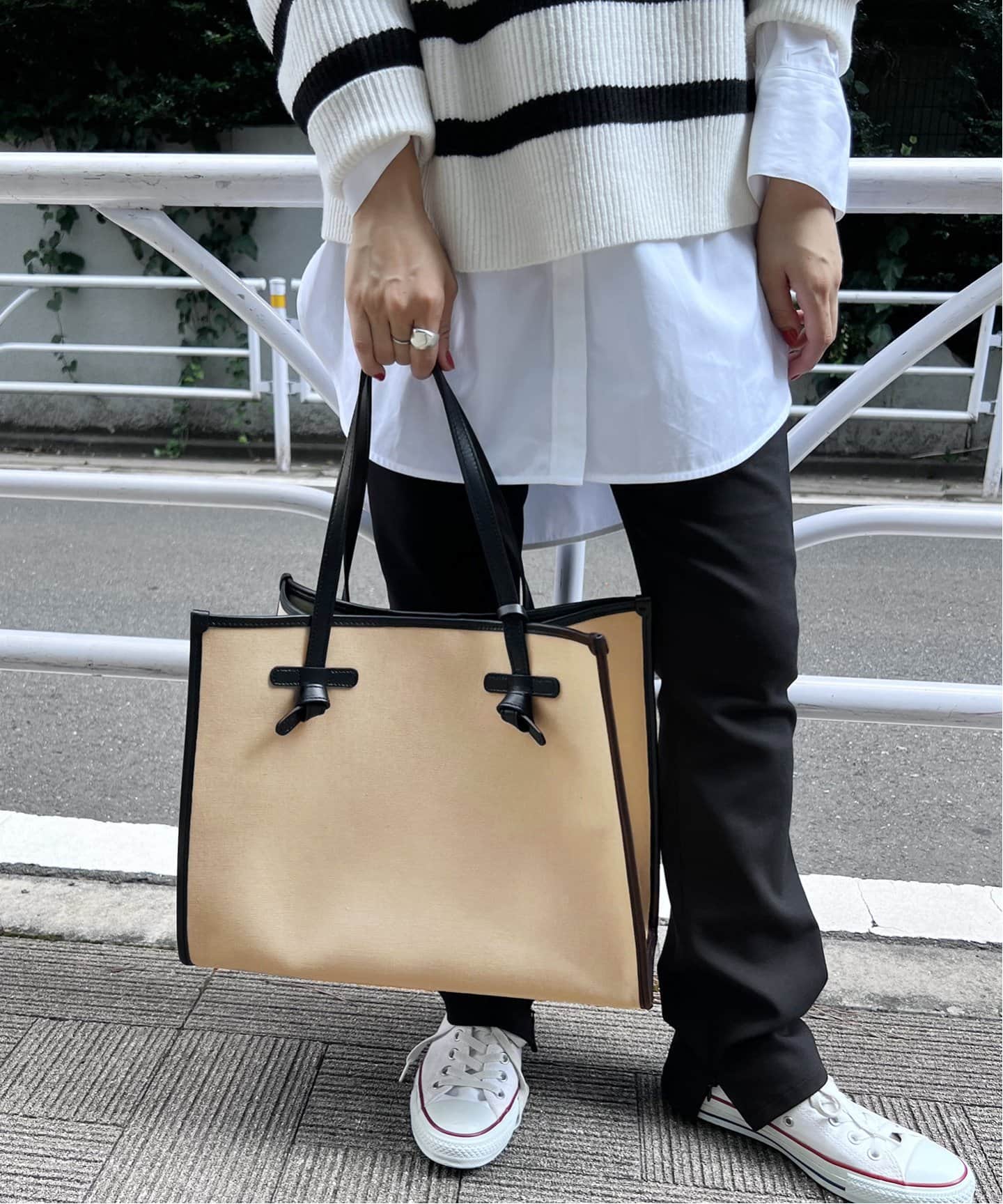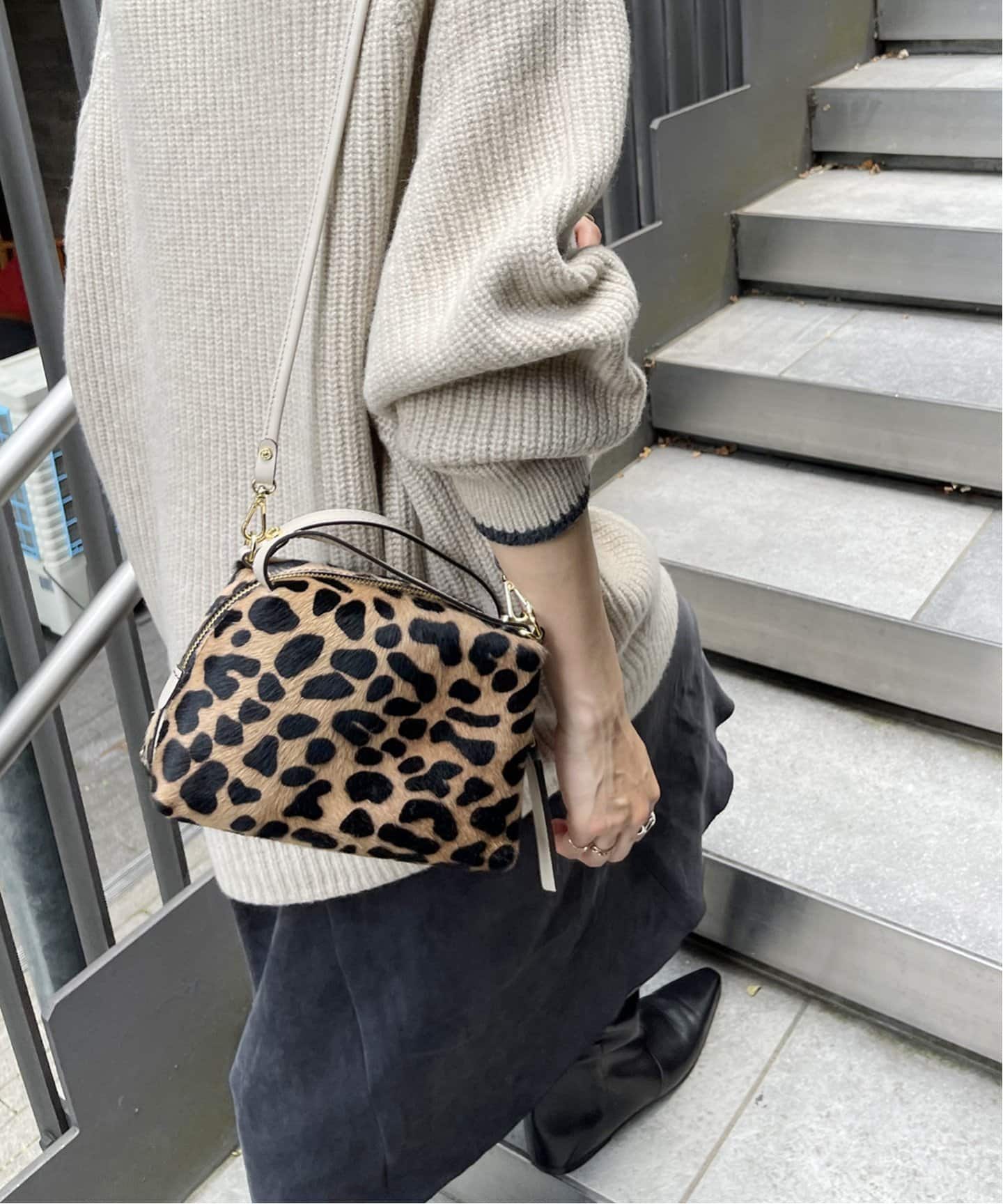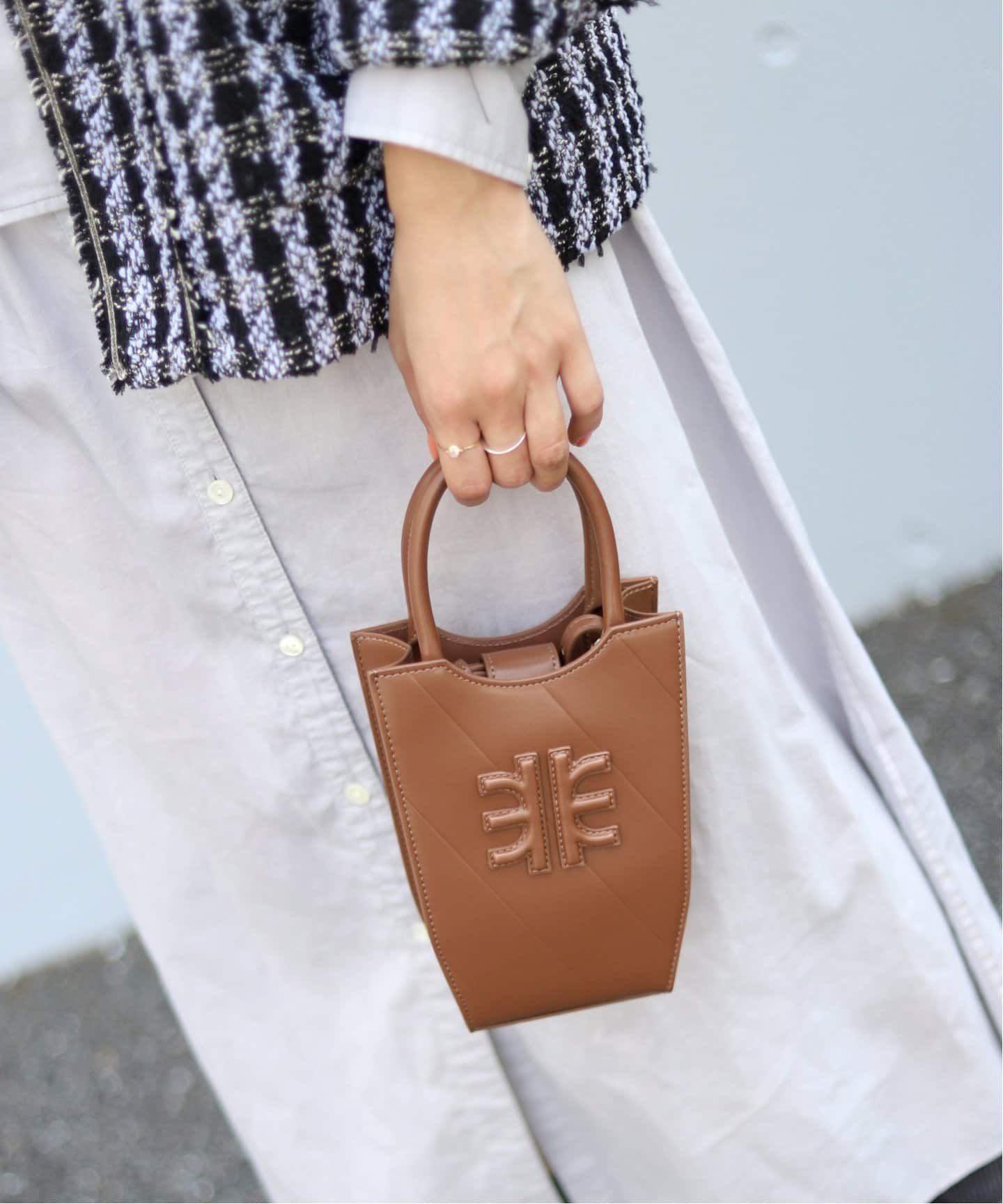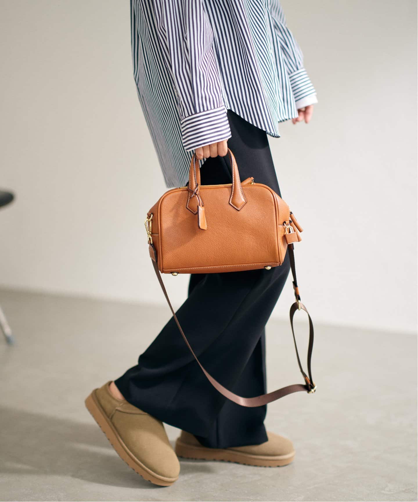 大人カジュアルを格上げFRAMeWORKの上質なキャメルのボストンミニバッグは、秋のカジュアルに投入するだけでクラシックな装いに格上げ。ショルダーが取り外し可能なのも嬉しいポイント。