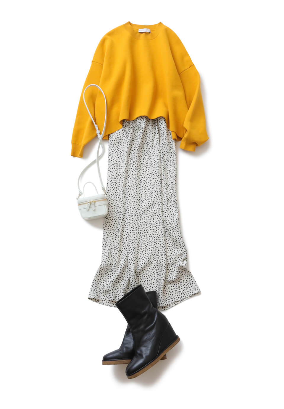 女っぽいサテンスカートは、ちょっぴりスパイシーなダルメシアン柄が秋の装いにマッチ。クロップド丈のオレンジプルオーバーを合わせることで今どきなシルエットバランスに仕上がり、顔まわりに華やかさも◎。モード感漂うショートブーツと可愛らしいミニバッグをトッピングして。