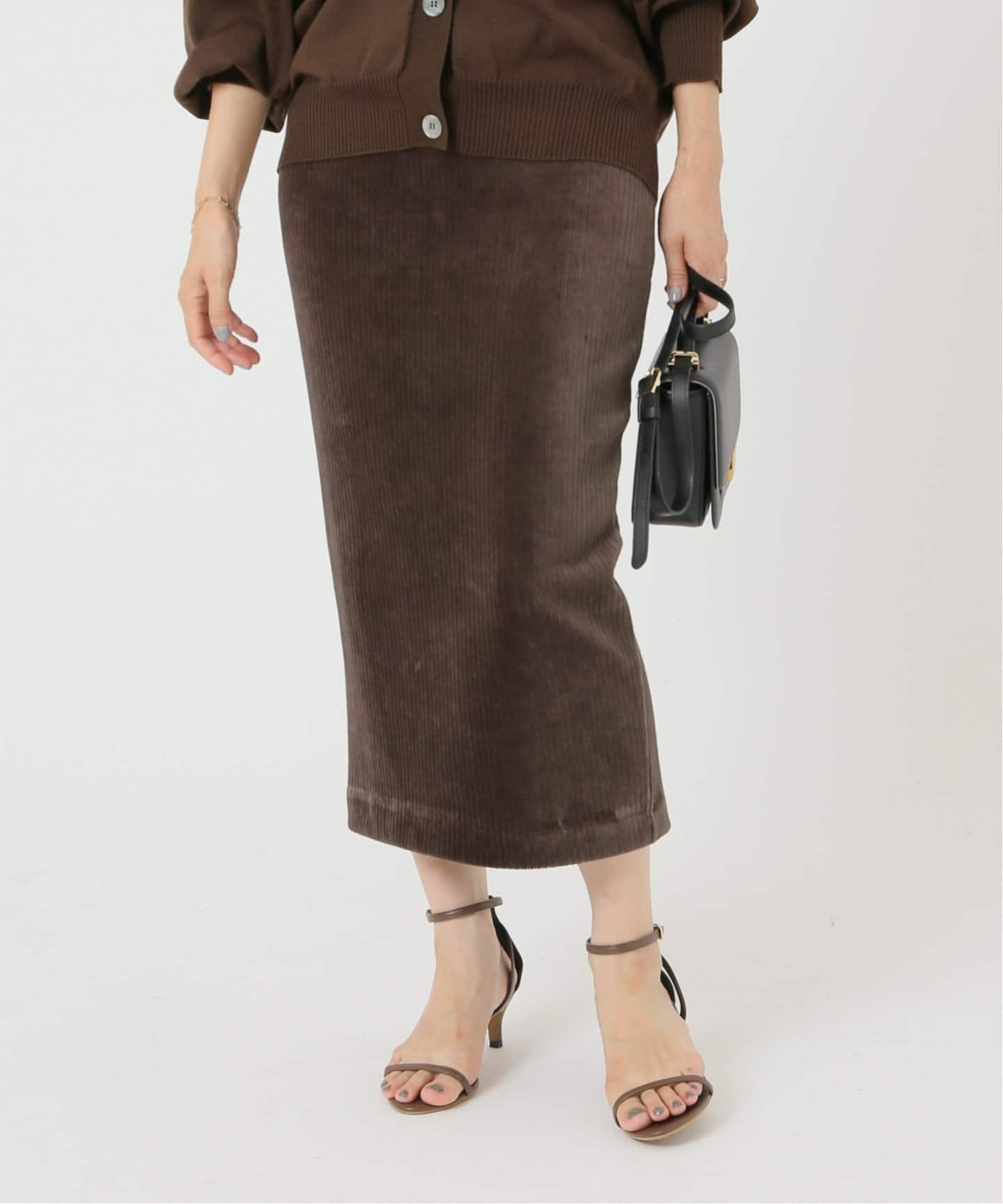 縦長シルエットで美人顔にコーデュロイのスカートはナローシルエットを選んで、子どもっぽく見せない工夫を。上品なブラウンならキレイめな印象が強まり、オフィスコーデにも最適。