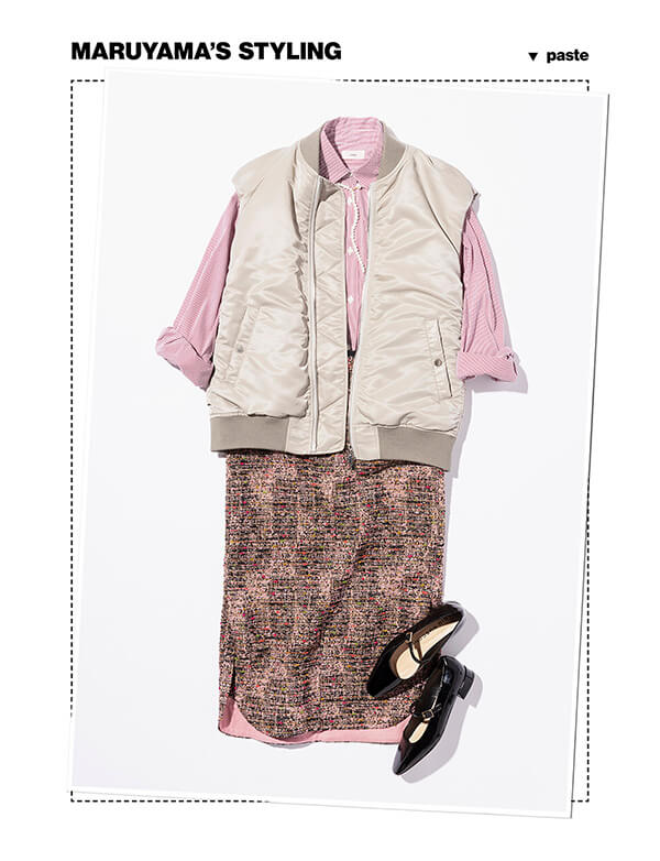 端正なストライプシャツをサイドスリット入りのツイードスカートにタックインした女性らしいスタイルに、ベストタイプにアレンジされたMA-1を羽織ってミリタリーテイストをプラス。正反対のテイストにも関わらずまとまって見えるのは、全体を淡いカラーリングで統一しているから。