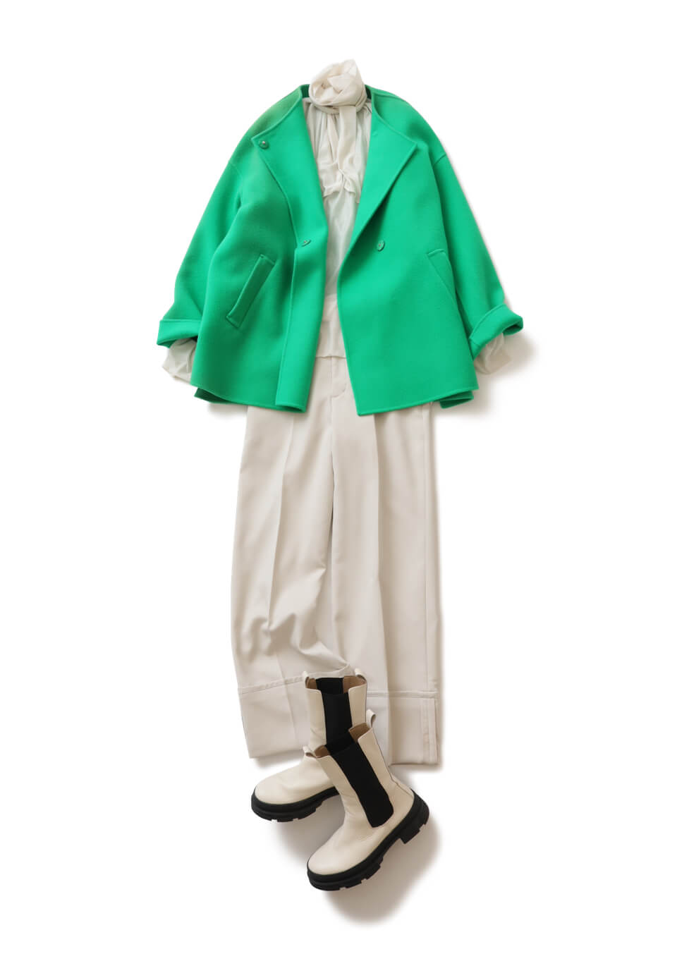 トレンドのシアーなカットソーにハンサムなスラックス、どちらもナチュラルな色味でつないで洗練されたワンツーコーデをメイク。ブーツも白系でトーンを合わせたサイドゴアブーツがグッドバランス。目を引く鮮やかなグリーンのショートコートを羽織ればメリハリがついて、お洒落指数も一気にアップ!