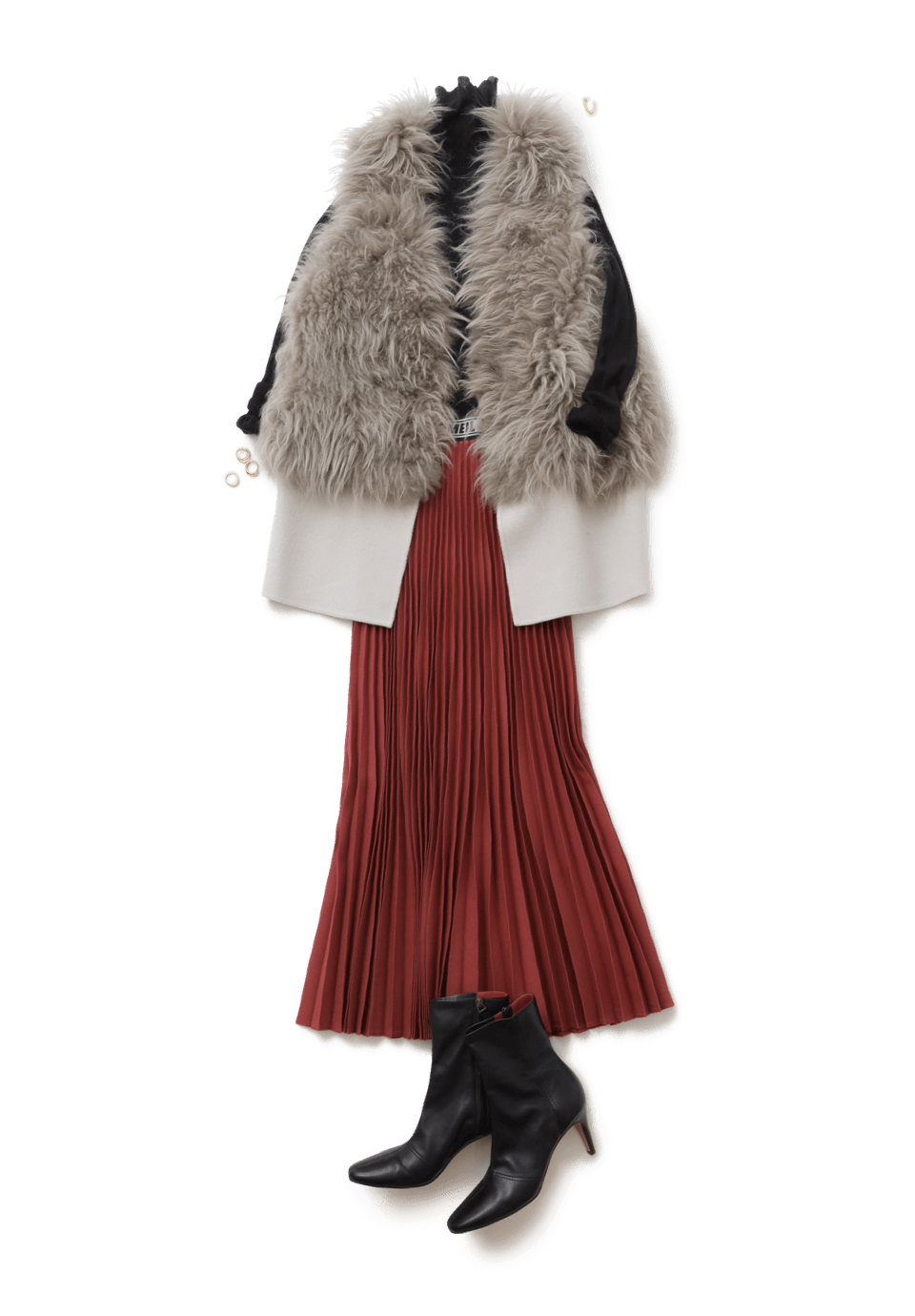 朝晩の寒暖差が大きくなり、コーディネートに迷う時期。そんな時は、一点投入で華やかに鮮度を高めるジレが出番。カシミヤファーを贅沢にあしらったリュクスなデザインでいて、ニットとドッキングすることでデイリーに使いやすくて◎。モダンなくすみピンクのプリーツスカートが洗練感もプラス。