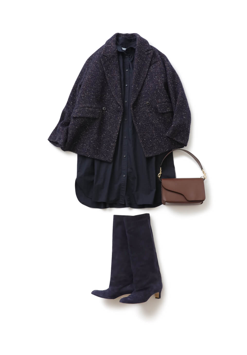 スッキリと落ち感のあるシルエットで着膨れしないチュニックシャツを単品でさらりと着こなして、ヘルシーに膝を見せるのが新鮮。筒広のネイビーロングブーツをつなぐことで、今っぽいスタイルバランスに仕上げて。アウターはヘリンボーンツイードジャケットが好相性。