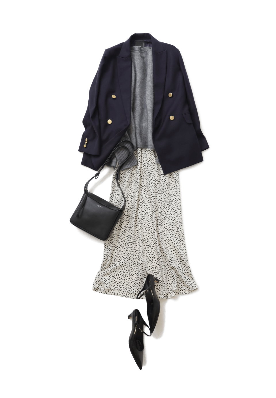 ふわっとソフトな肌触りが病みつきになるファーニットは、上品で大人っぽいグレーをセレクト。ダルメシアンプリントのナロースカートをつないで、シュッと見えの大人フェミニンをメイク。金ボタンのネイビージャケット、黒のバッグ&パンプスを合わせることで、いっそうエレガントに。
