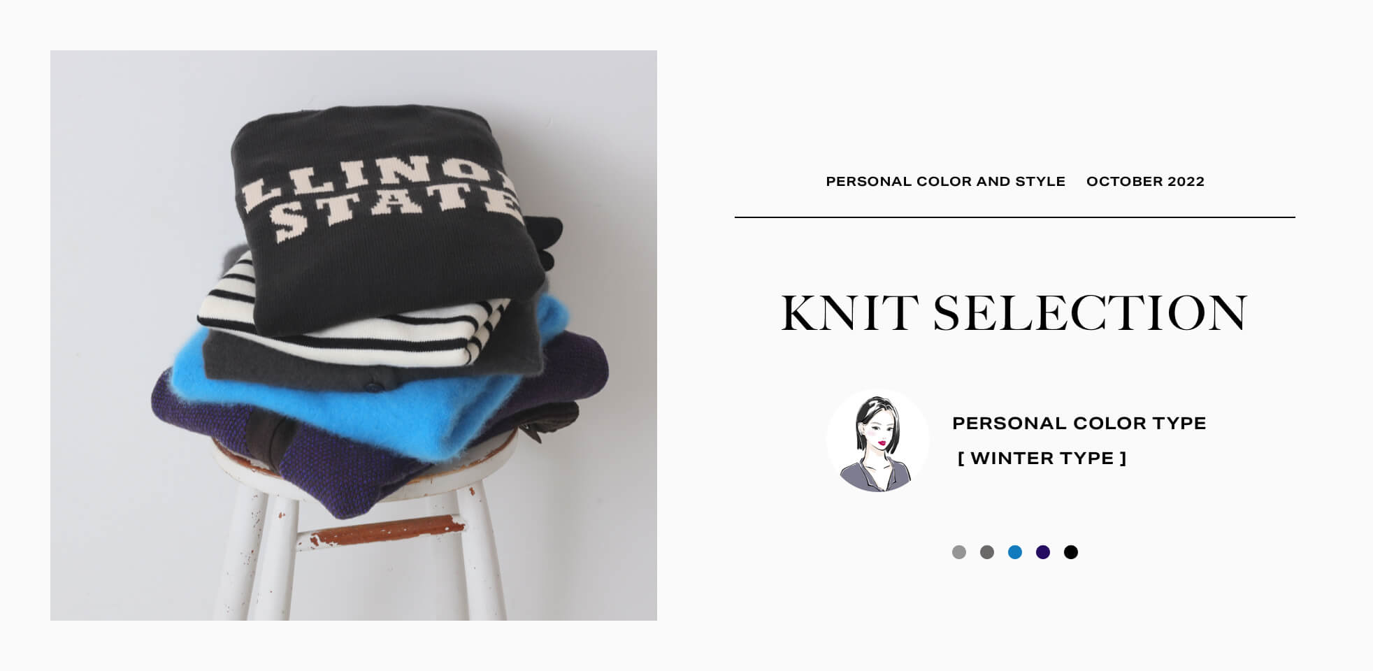 - 暗めのモノトーン基調が多いウィンタータイプは、柄や色で遊びを加える手も◎。ボーダーはコントラストのはっきりしたもの、ブルーのニットは混じり気のない鮮やかなカラーを選んで。ブラックでもミックスヤーンニットならのっぺりせず暖かみのある雰囲気に。