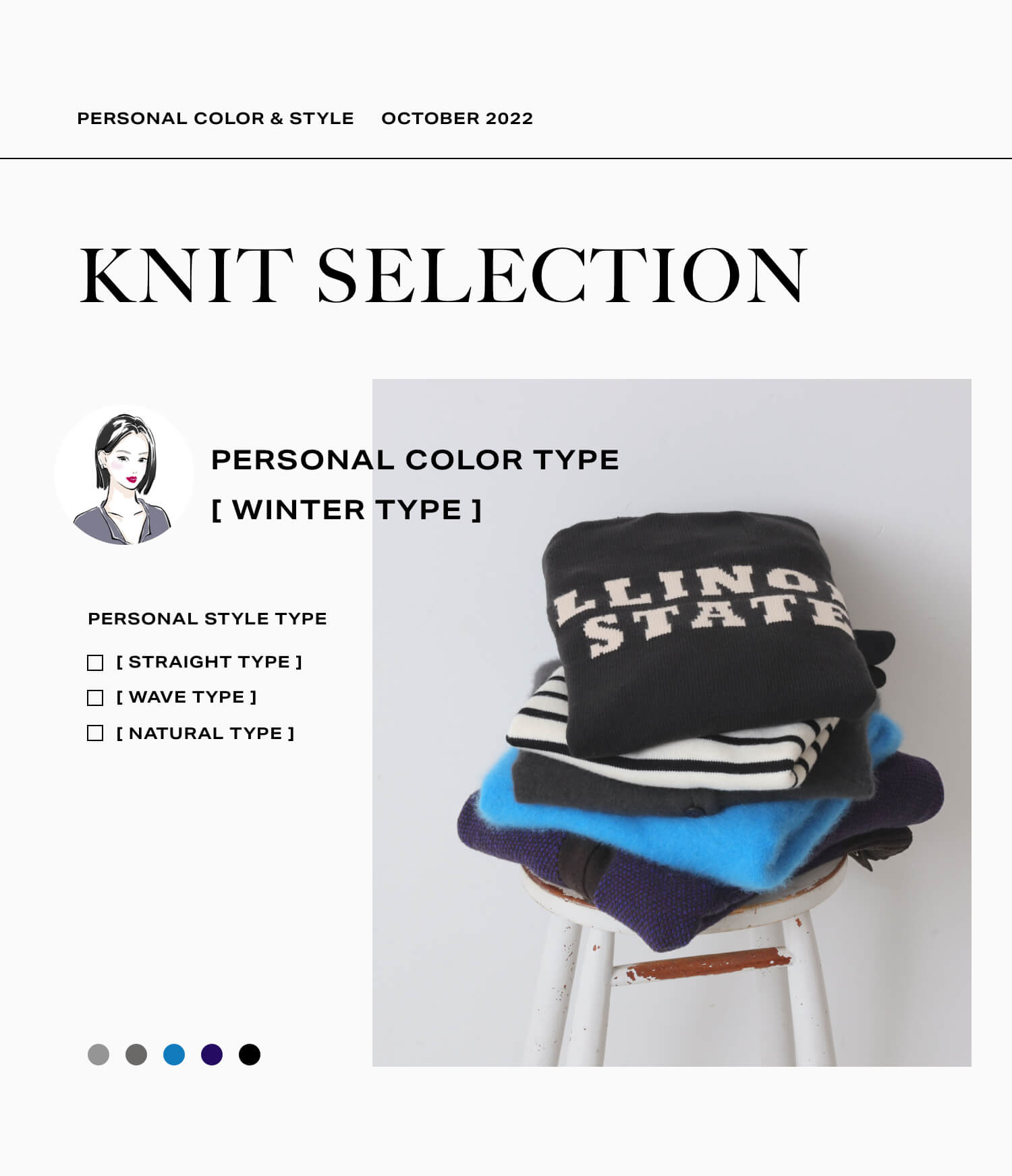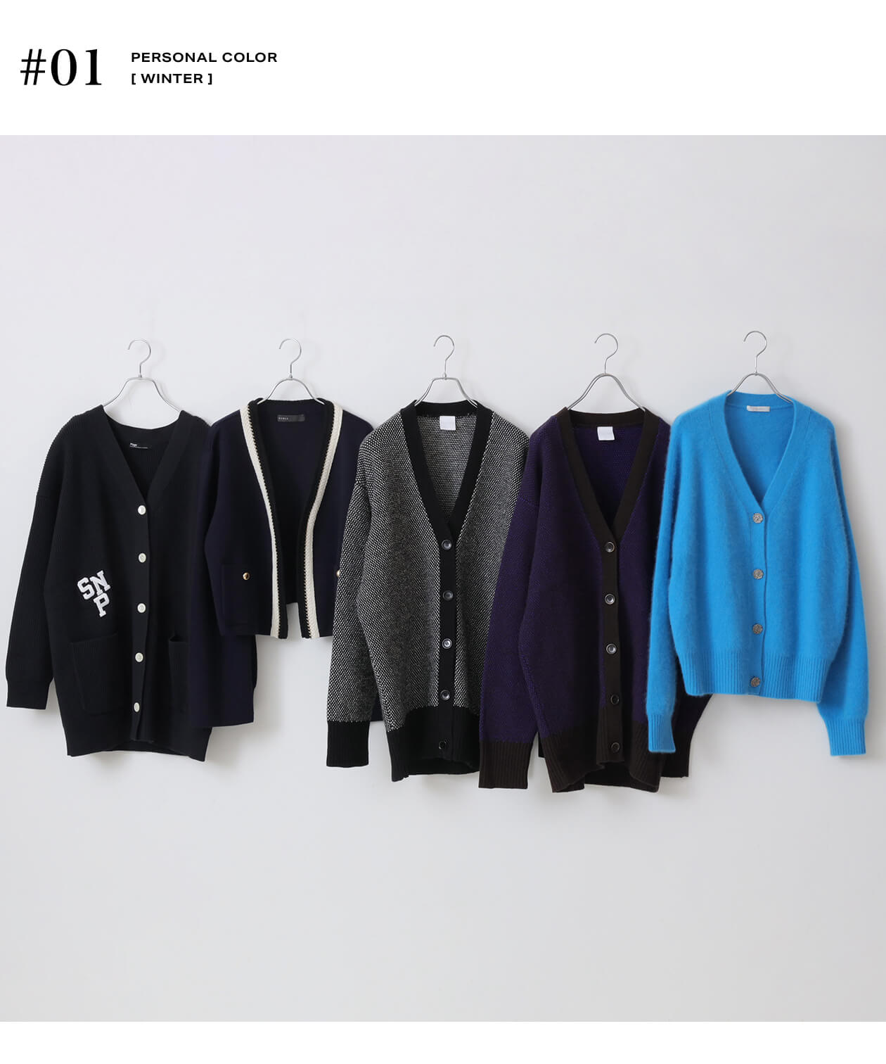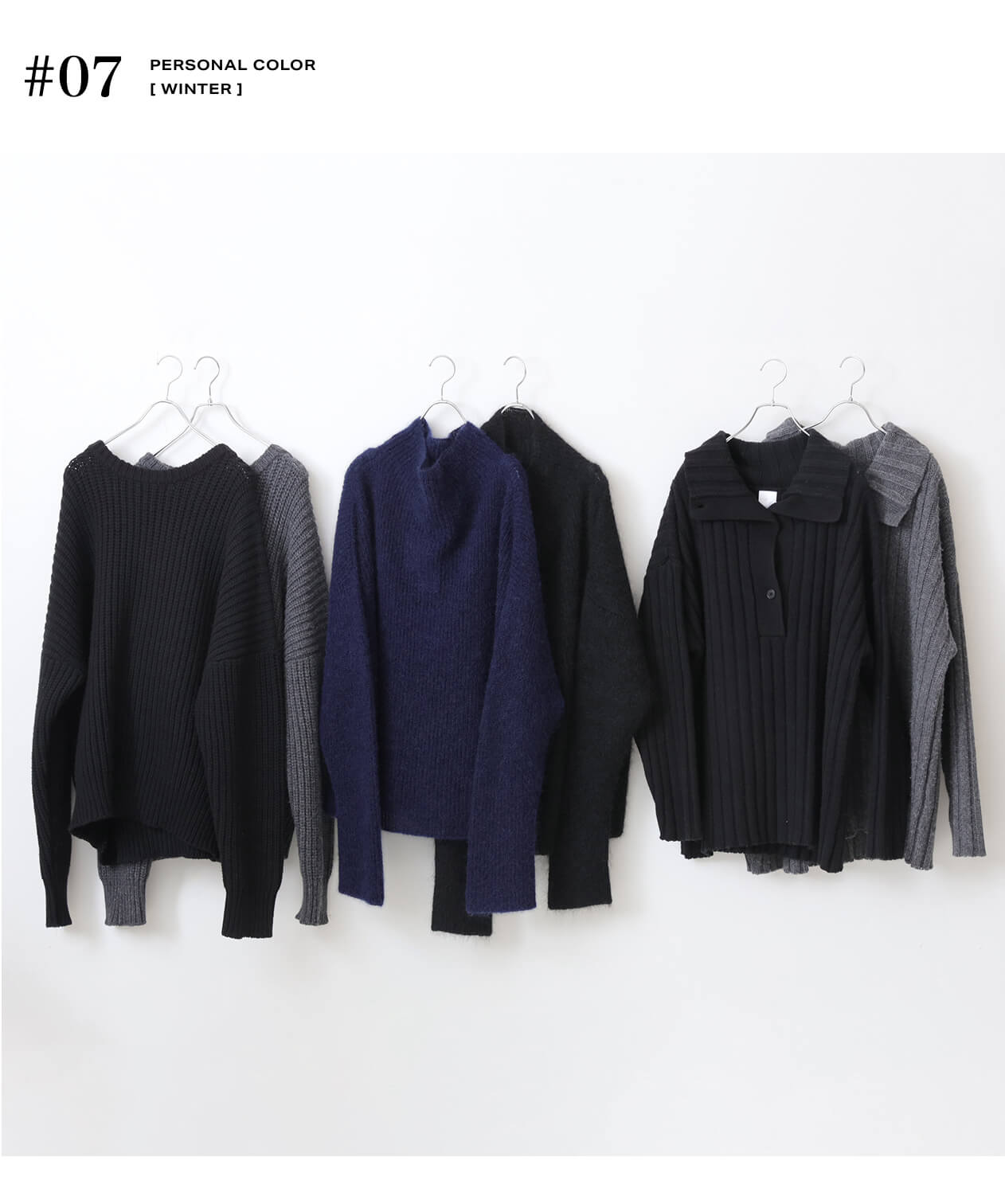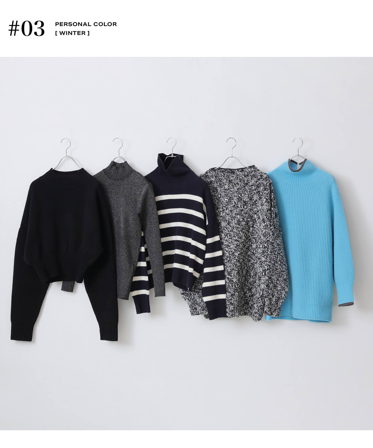 - ウィンタータイプのベーシックカラーは青みとくすみのない色味がポイント。コントラストのはっきりとしたモノトーンや、ブラウン・ネイビーは黄みのない色味をチョイスして。どんなスタイルのボトムスとも相性の良いボックスシルエットをラインナップ。