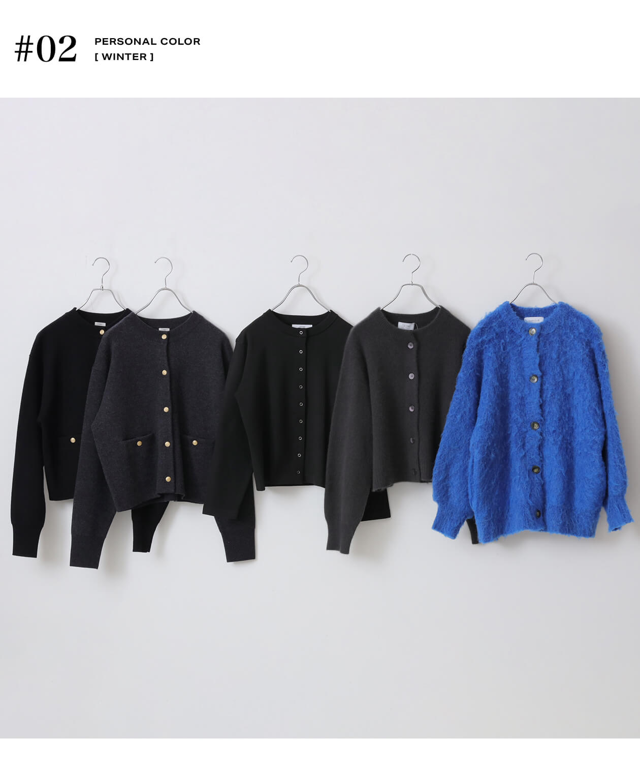 - きちんと見えするクルーネックカーディガンはブラック基調のニュアンスカラーをチョイス。ブルーのシャギーニットはモノトーンとも相性抜群です!ボリュームシルエット&表情豊かな素材感なので、秋冬コーデの主役にピッタリ。