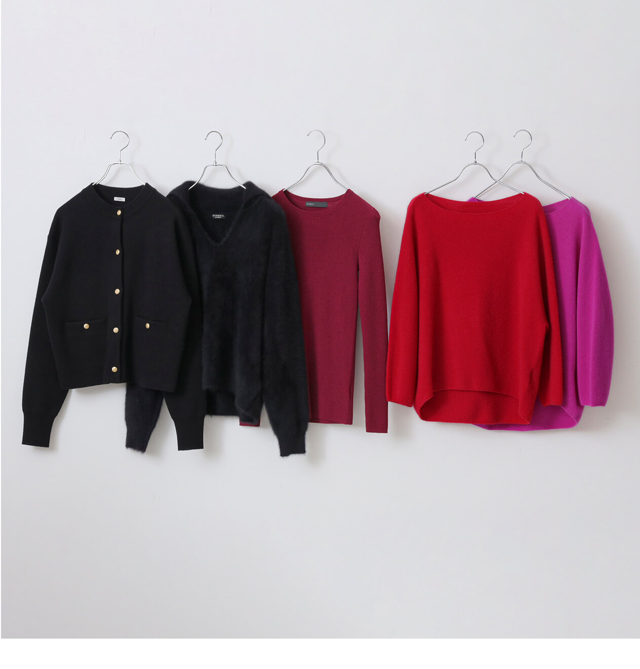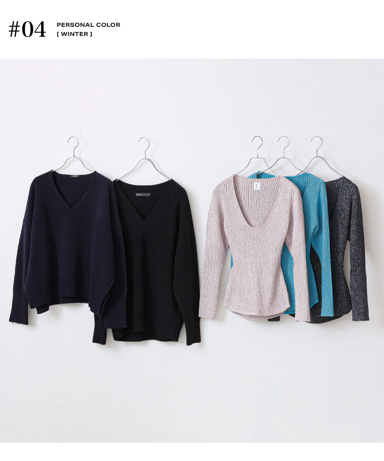 - ベーシックなブラック・ネイビーのVネックニットに、カラフルなバックオープンニットのラインナップ。どうしてもクールな色味が多くなりがちなので、ラメ入り素材で華やかさを引き立たせて。デコルテをキレイに演出するNOBLEのニットは、ネックレスなどで華やかさをプラスして。