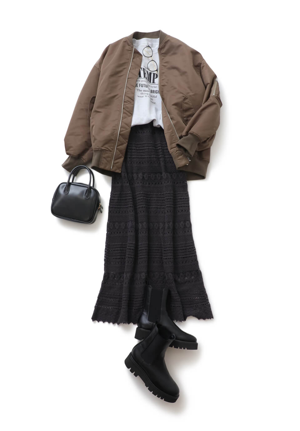 寒暖差が大きく朝晩はアウターが必要な今、一枚あると便利なのが地厚すぎないスウェット。スカートにタックインしてももたつかずシュッと見えするロゴスウェットは、ロンT感覚でスタイルバランスがとりやすく、こなれ感たっぷりの着こなしに。サイドゴアブーツ&MA-1をトッピングして重厚感をプラス。