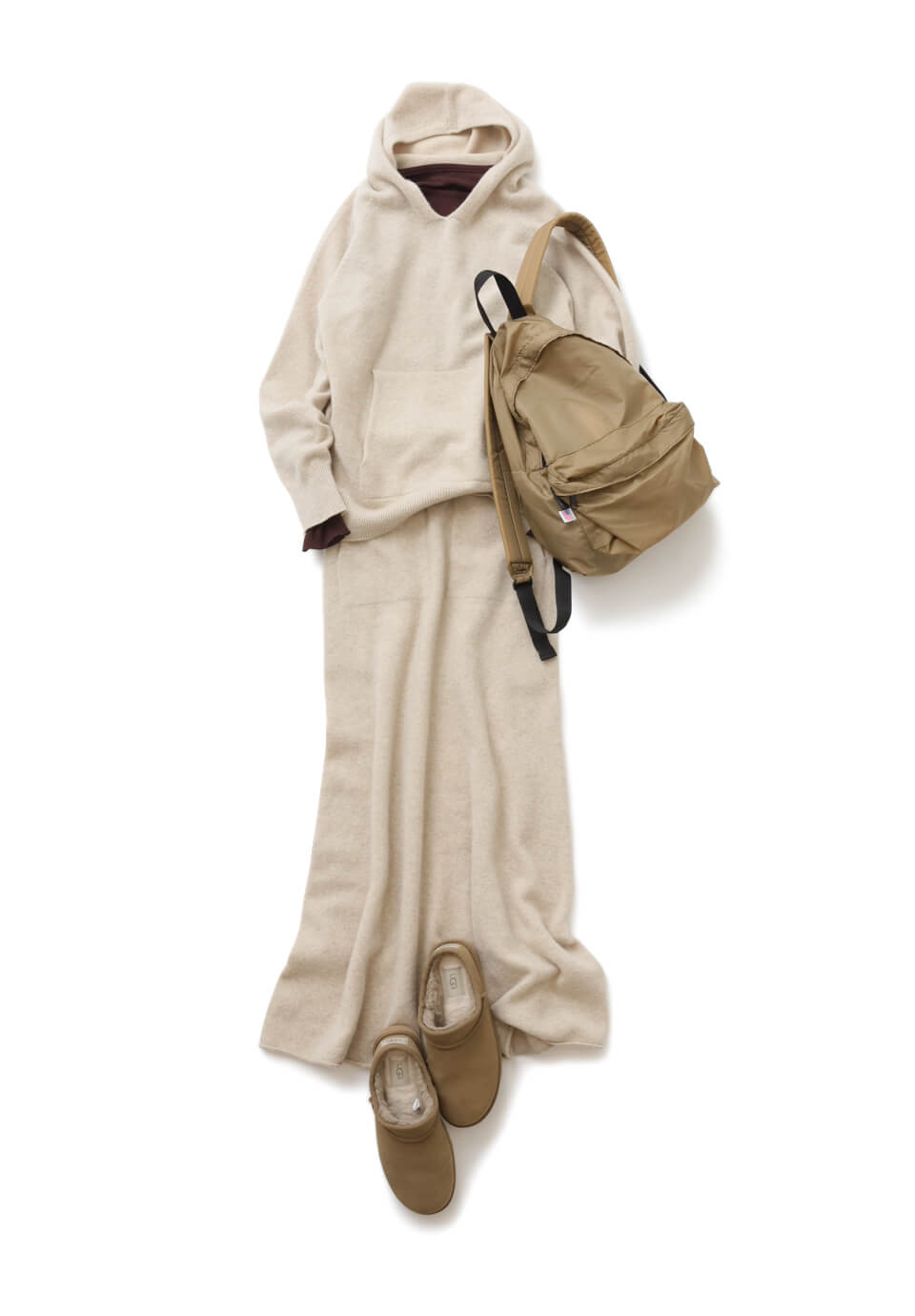 パーカー×マキシスカートの大人リラクシーなフェミニンカジュアル。気負わないスタイルを、秋冬らしいニットのセットアップに更新するだけで鮮度が急上昇。女性らしい柔らかさも加わって◎。リュックとムートンスリッパもベージュで合わせれば、さらに統一感がアップ。