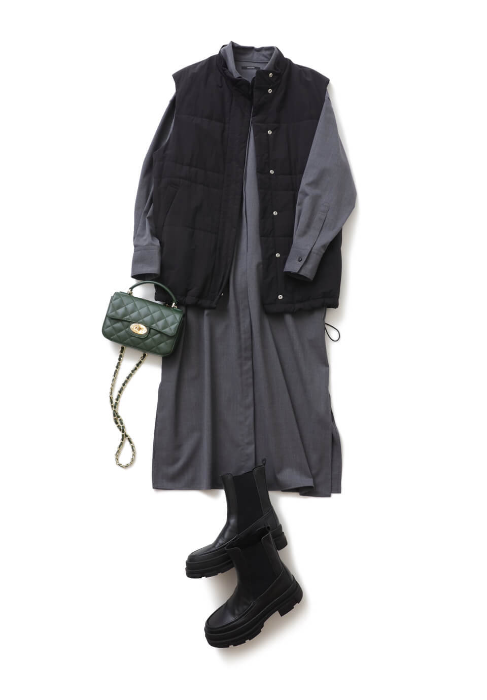 オフの土曜日は楽ちんなワンピーススタイルで買い物へ。あったか素材だけど自宅で洗えるシャツワンピースにパフベストを重ねた、軽くてあたたかいリラクシーコーデが最適。濃色まとめでほっこりを回避。コーデを格上げするチェーンバッグ、重ためなサイドゴアブーツをアクセントに加えて。