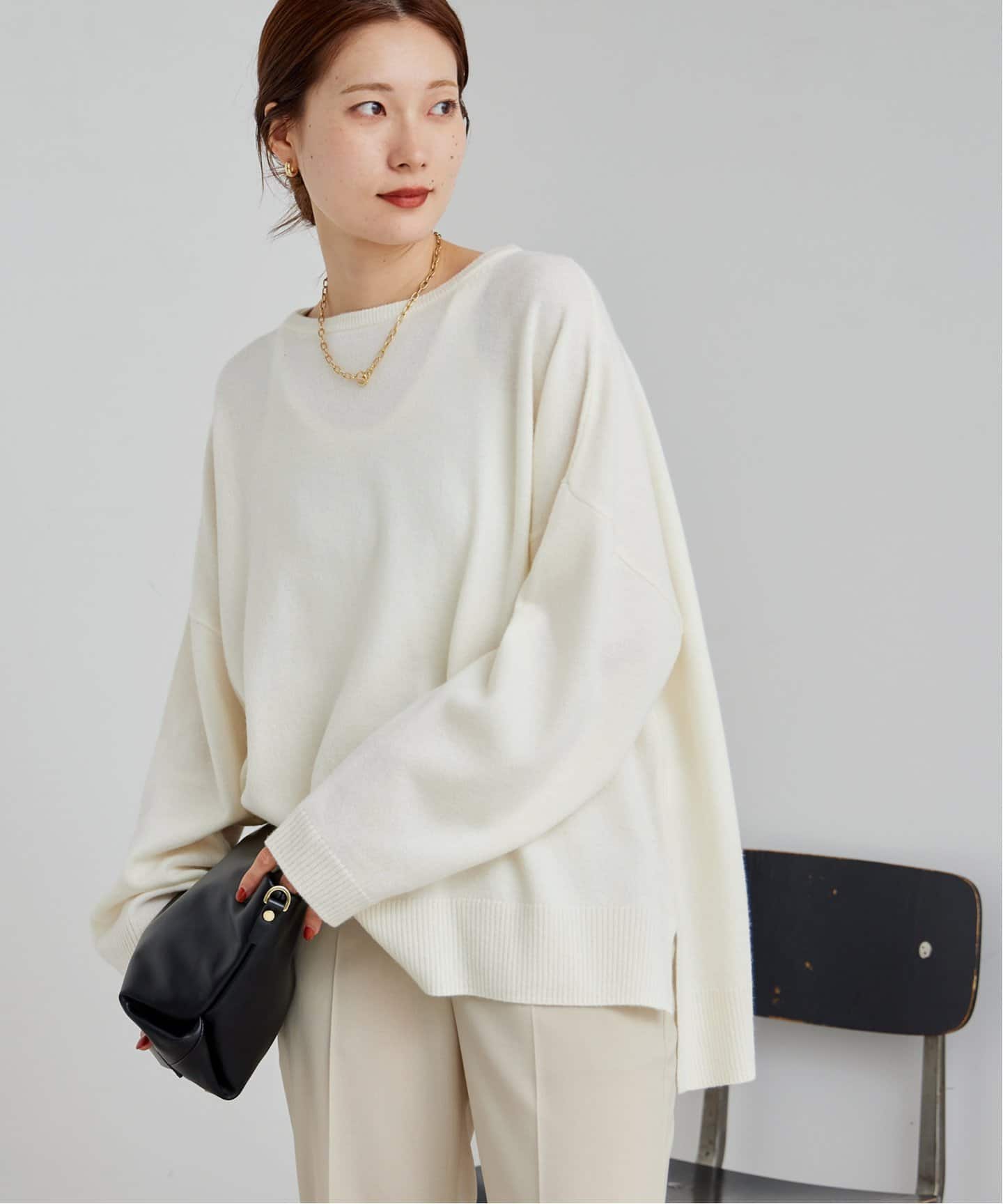 ホワイトトップストラッドコーデが簡単に叶うチルデンニットや、カレッジスウェット風のロゴニット。どちらも白を選ぶことで子どもっぽく見えず、女っぽいムードがプラス