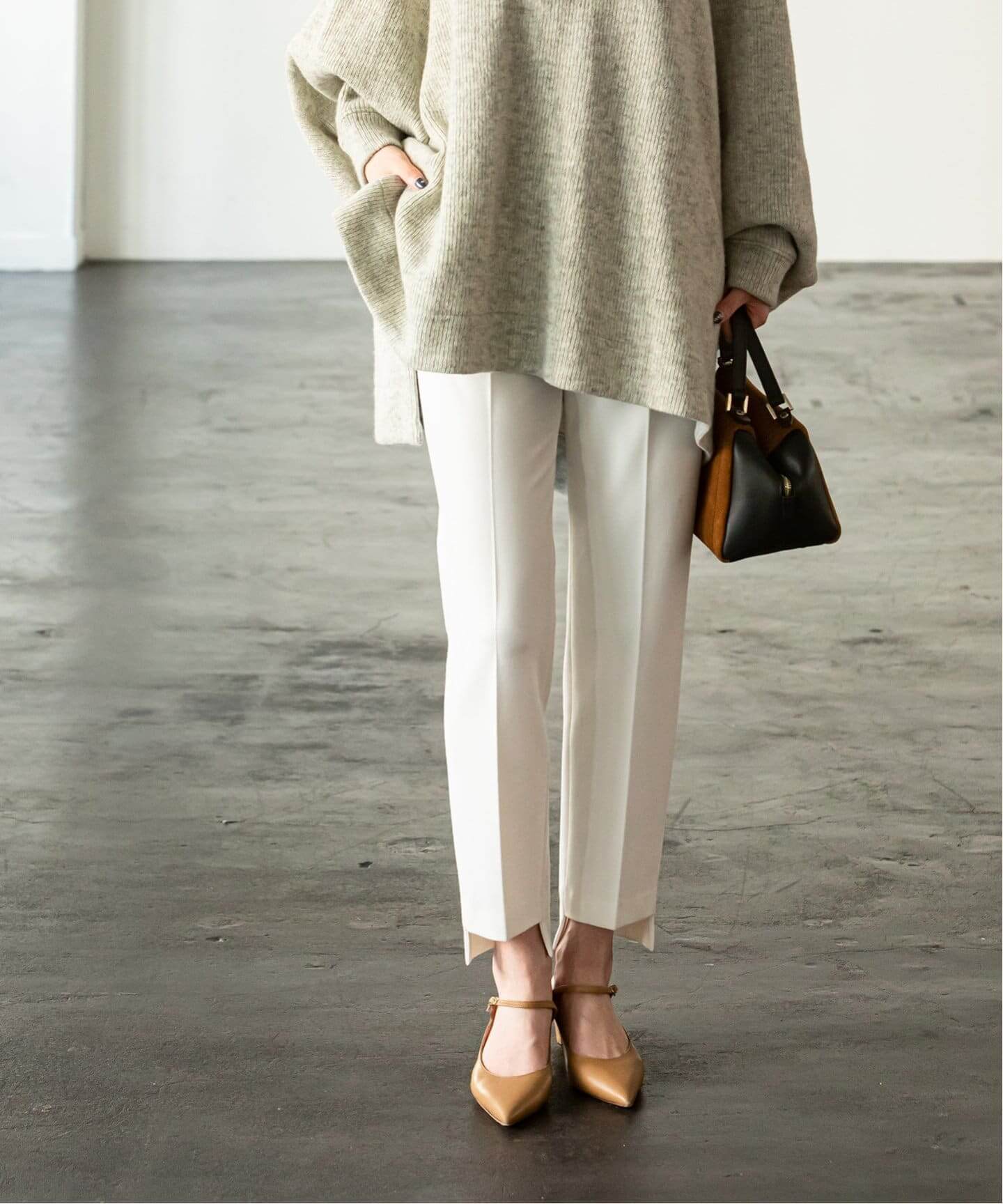 冬コーデを可憐に暖色や濃色でまとまりがちな秋冬コーデに軽さと可憐さを加える白ボトムス。キレイめなシルエットならオンにもオフにも兼用できて、全体を明るくブラッシュアップ。
