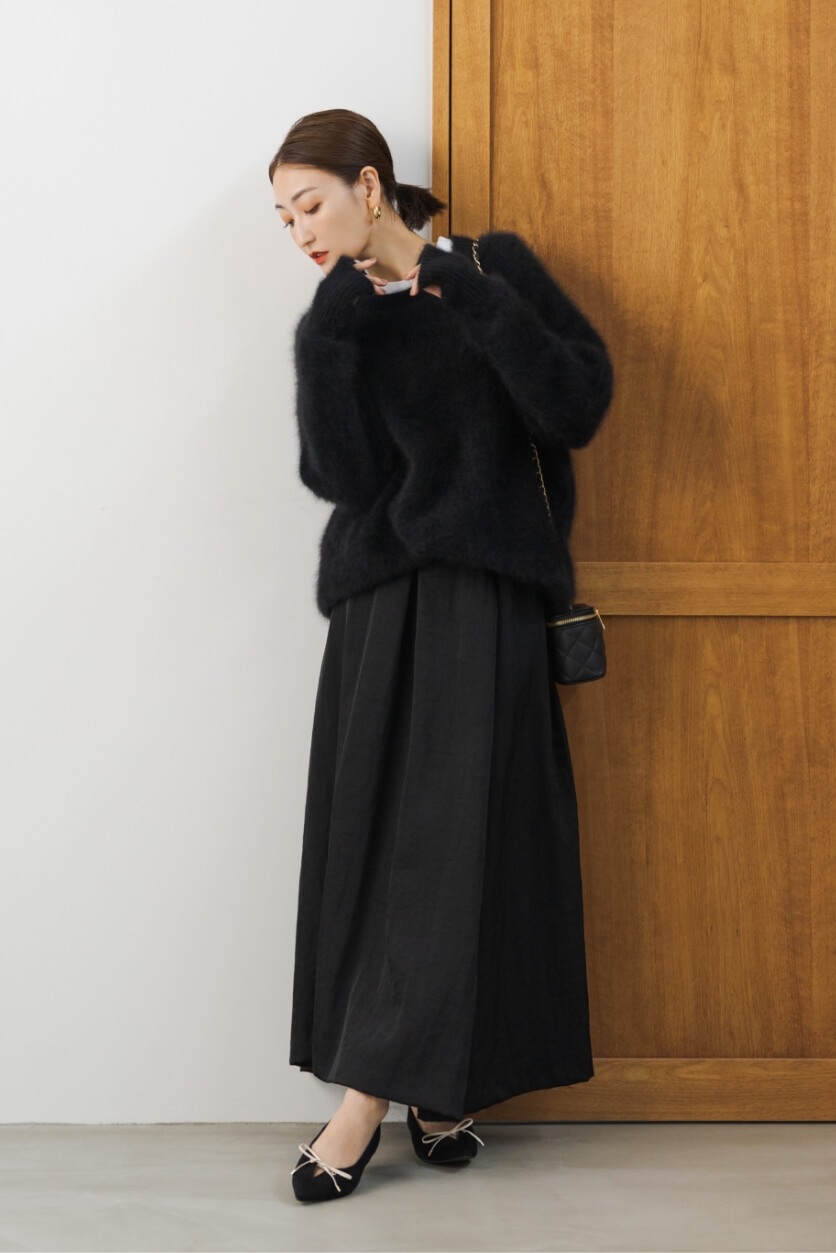 定番で持っていたいブラックのフラットシューズ。甘くなりがちなリボンのデザインもモードな表情に。足元の白リボンは、オールブラックスタイルで首元に白のカットソーを覗かせるように抜け感を演出するテクニックとして有効です。ITEMS