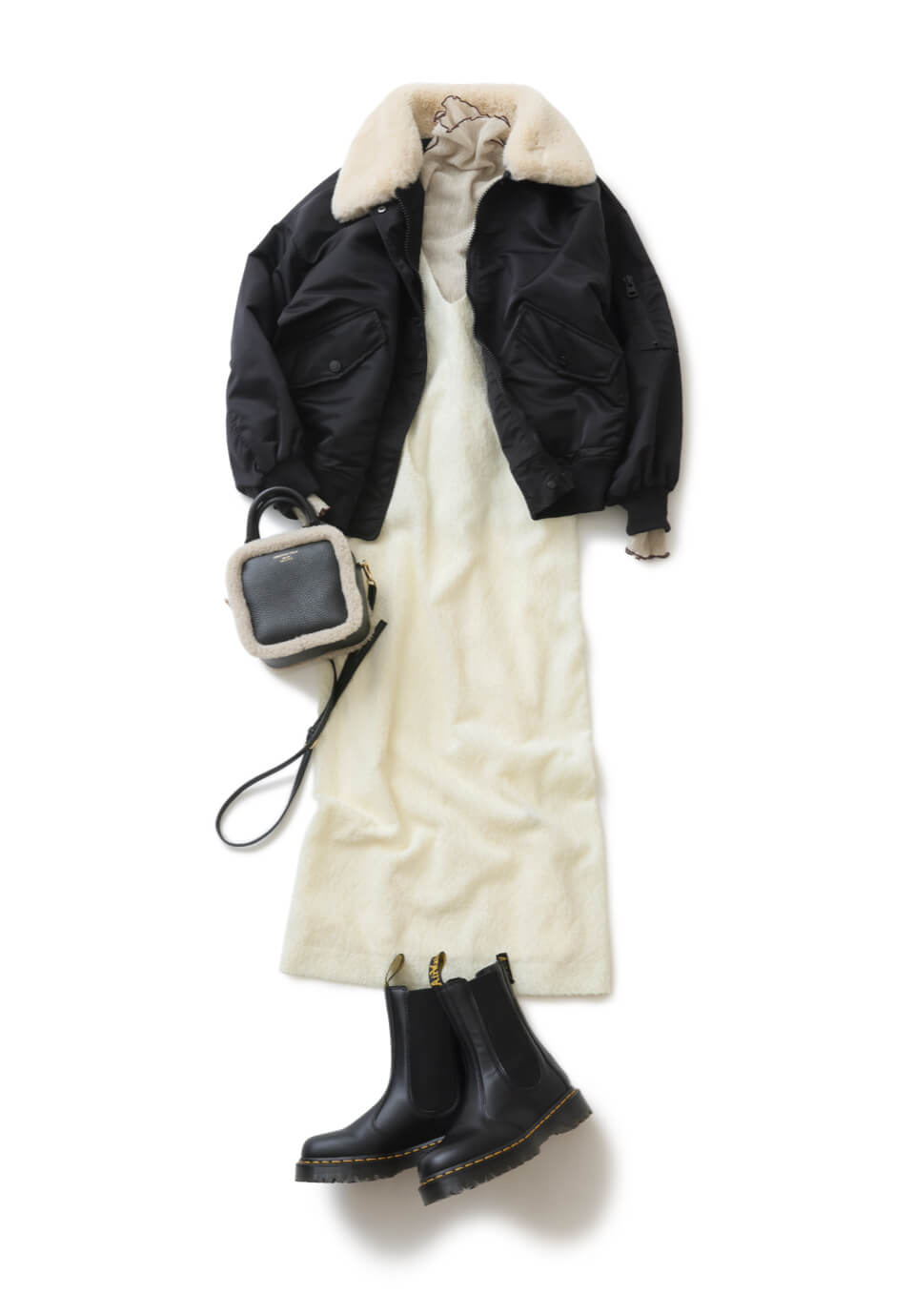 レイヤードが一気に今年顔になるメロートップスをインしたホワイトワンピースコーデ。抜け感のある素材やキャミの女っぽさが光るフェミニンコーデには、ブラックのボンバージャケットとサイドゴアブーツを合わせて辛さと季節感を足し算。バッグも、アウターのもこもこにリンクさせて。
