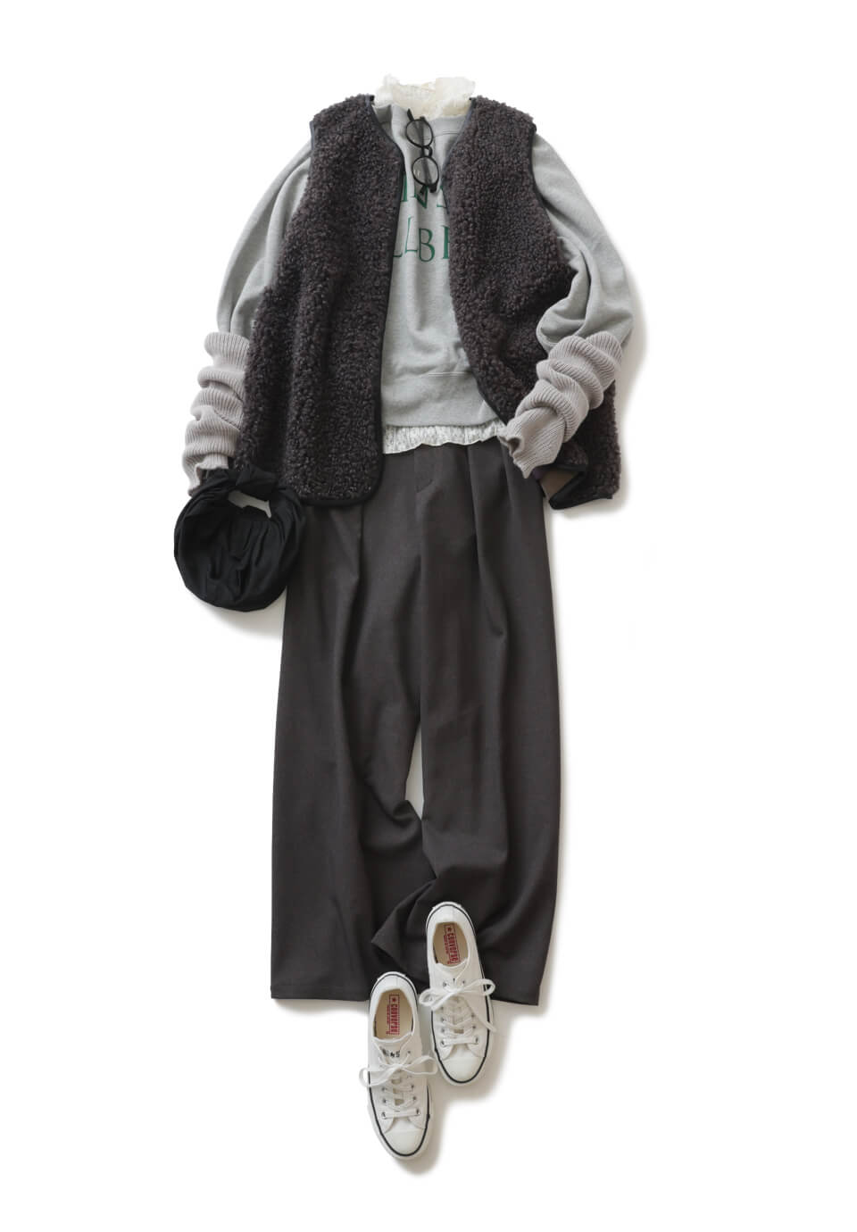 キャッチーなグラフィックのスウェットを、グレーベースでマスキュリンなボトムスとつなぐことで大人っぽくまとめて。レースのハイネックインナーをチラ見せして、今年らしい女っぽいディテールをひとさじ。仕上げにもこもこのジレを重ねれば、一気にマニッシュコーデの鮮度がアップ。