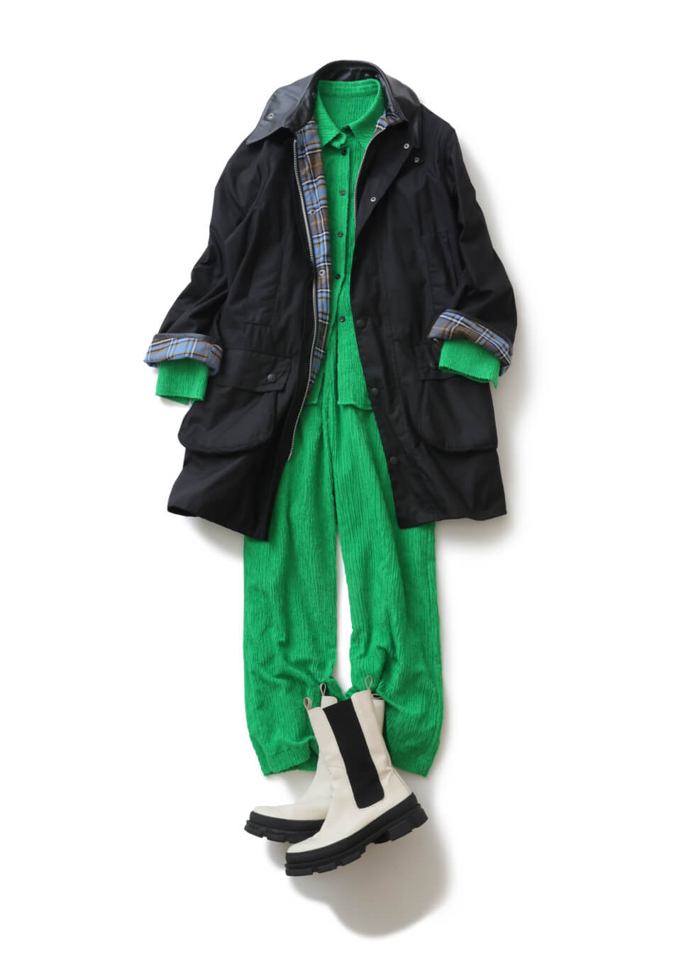 ブリティッシュでメンズライクなBARBOURのオーバーサイズコートは、袖を捲って裏地のチェック柄をチラ見せするのがおすすめ。表情豊かなブークレ糸のシャツ×パンツをセットで合わせて、モードなグリーンを効かせて。肩肘張らないリラックス感とモード感が加わって、正統派アウターの新しい着こなしに昇華。
