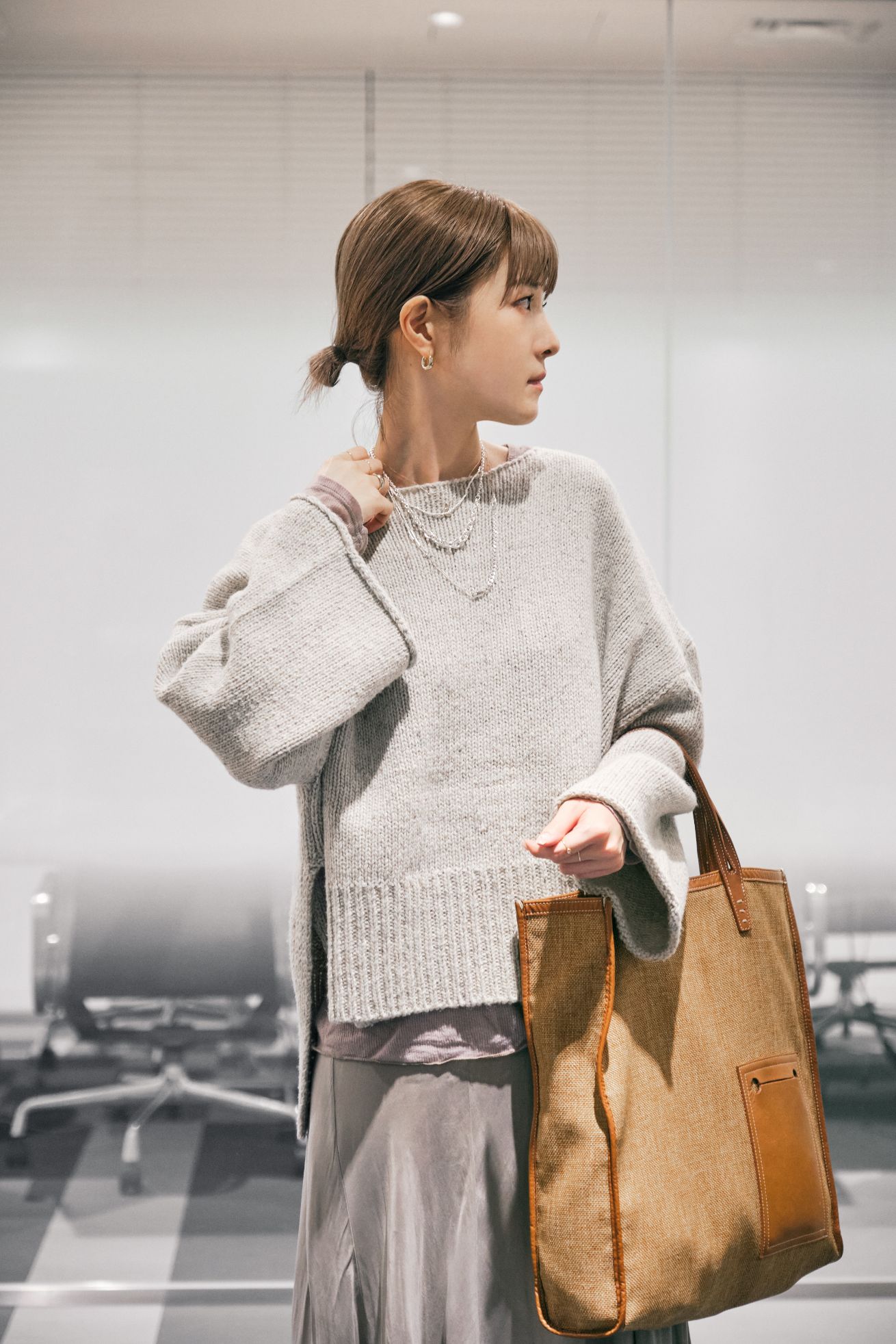 気負わずラフに取り入れたいこの日もカラーアイテムに挑戦!ピンクは個人的にかなり勇気のいるカラーですが、スウェットの肩掛けなら取り入れやすいかなと思いました。周りからも好評だったので良かったです。デスクワークは足元が冷えますが、着丈が長めのニットで快適に過ごしています。シルエットも可愛く、温かいのがとても気に入っています。今日は打ち合わせが重なり、持ち歩く資料も多めなのでバッグはビッグトートが頼りです!