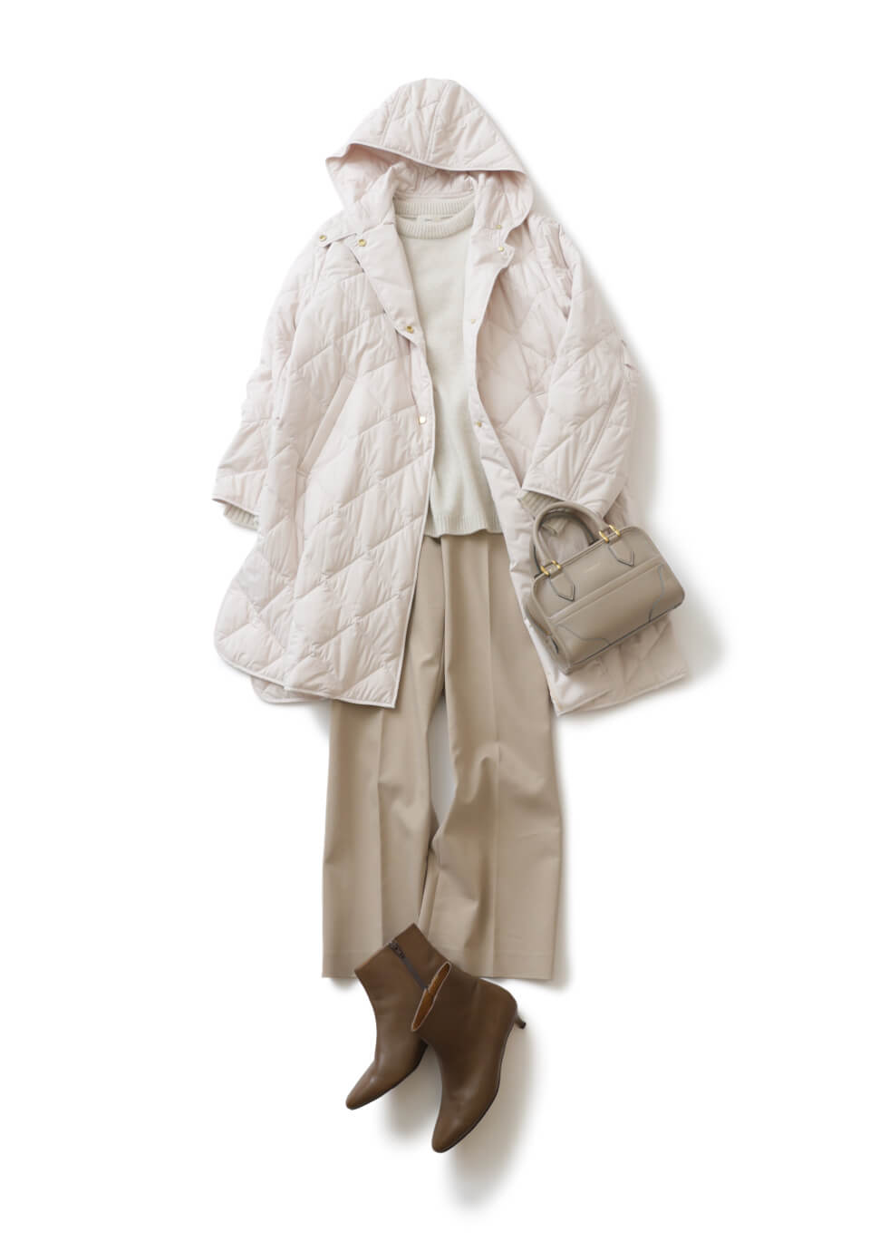 軽くて温かいキルティングアウターが活躍する季節が到来。スポーティなベンチコートのスタイルだけど、上品なオフ白だから女っぽく着られて◎。インナーのニットやパンツはトーンを合わせたナチュラルでまとめて、洗練されたオフィススタイルに昇華。バッグ&ブーツも同系色で。