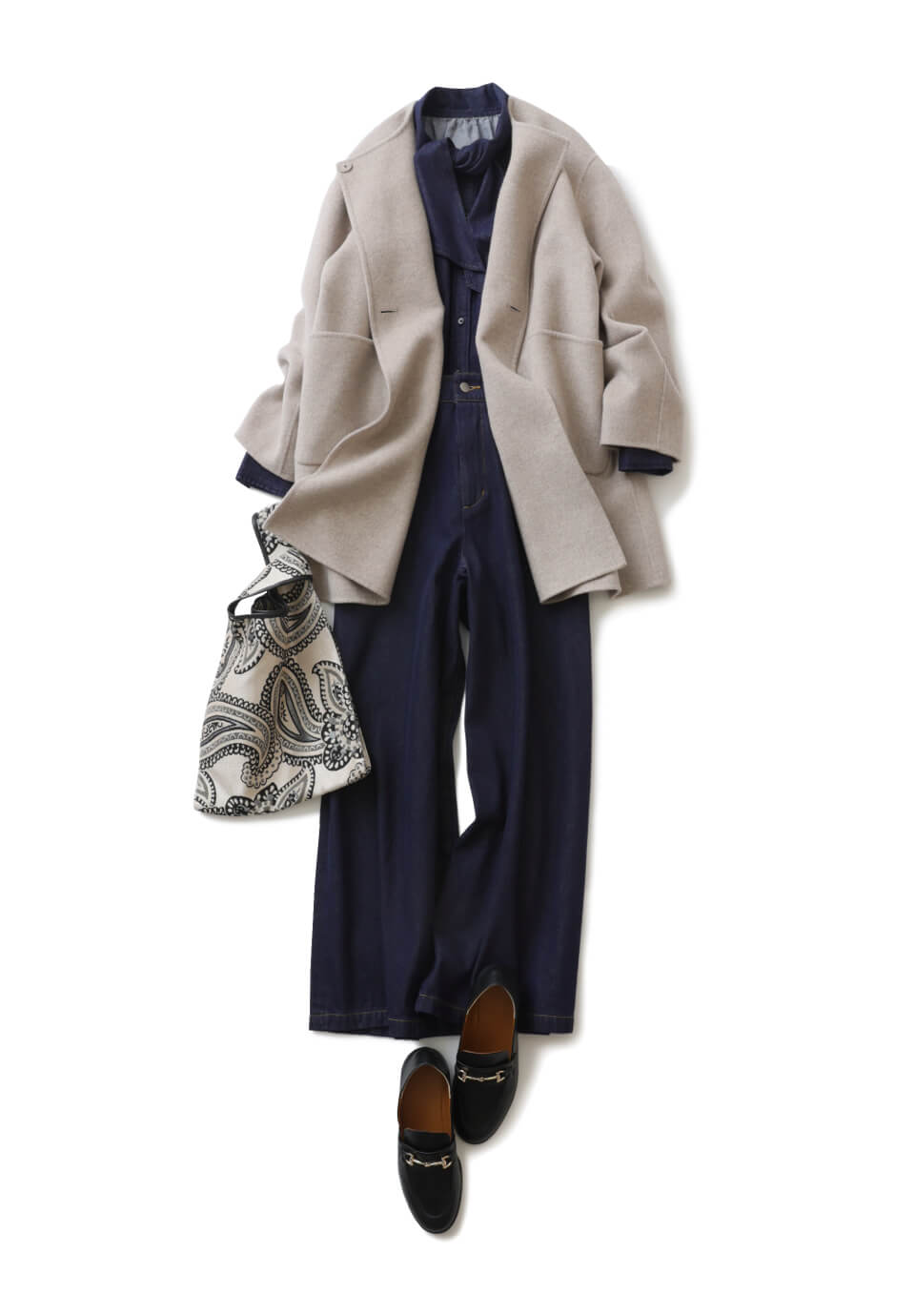 まるでデニムのような風合いが楽しめつつ、色落ちしないからデイリーに使いやすいボウタイブラウス&バギーパンツをセットで。顔まわりを華やかに演出するボウタイも、デニムライクな素材ならいっそうこなれた印象に。さっと羽織ってサマになる上品なミドルコートとクラシカルな小物をトッピング。
