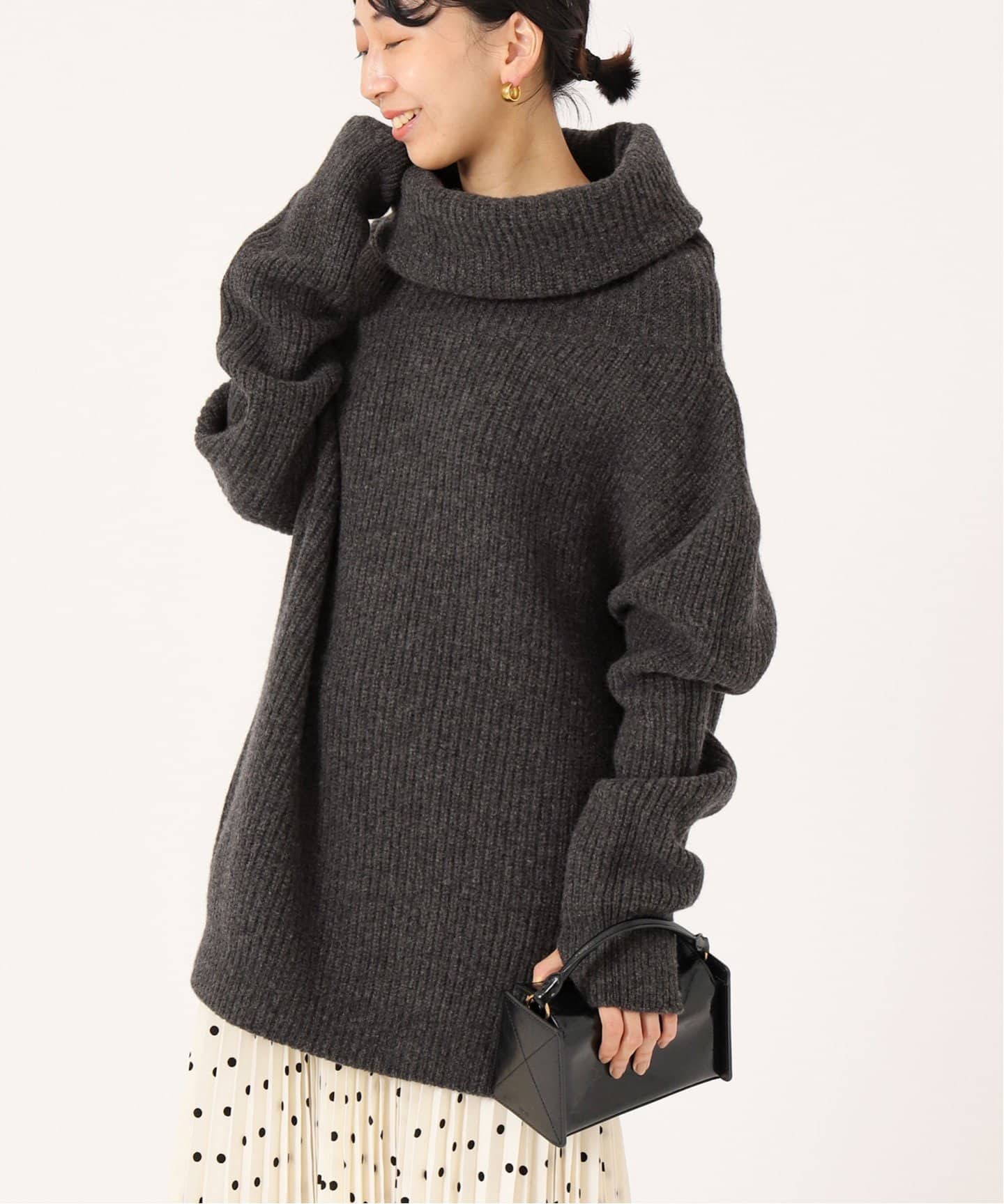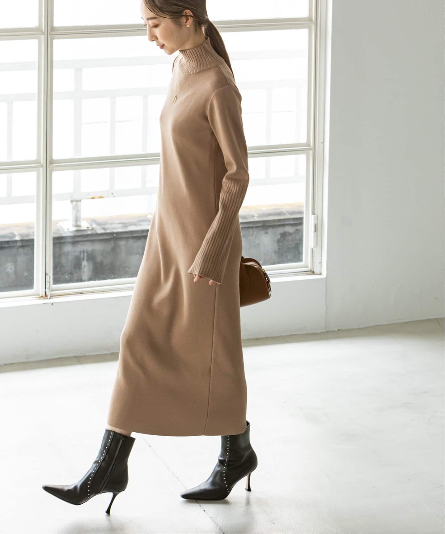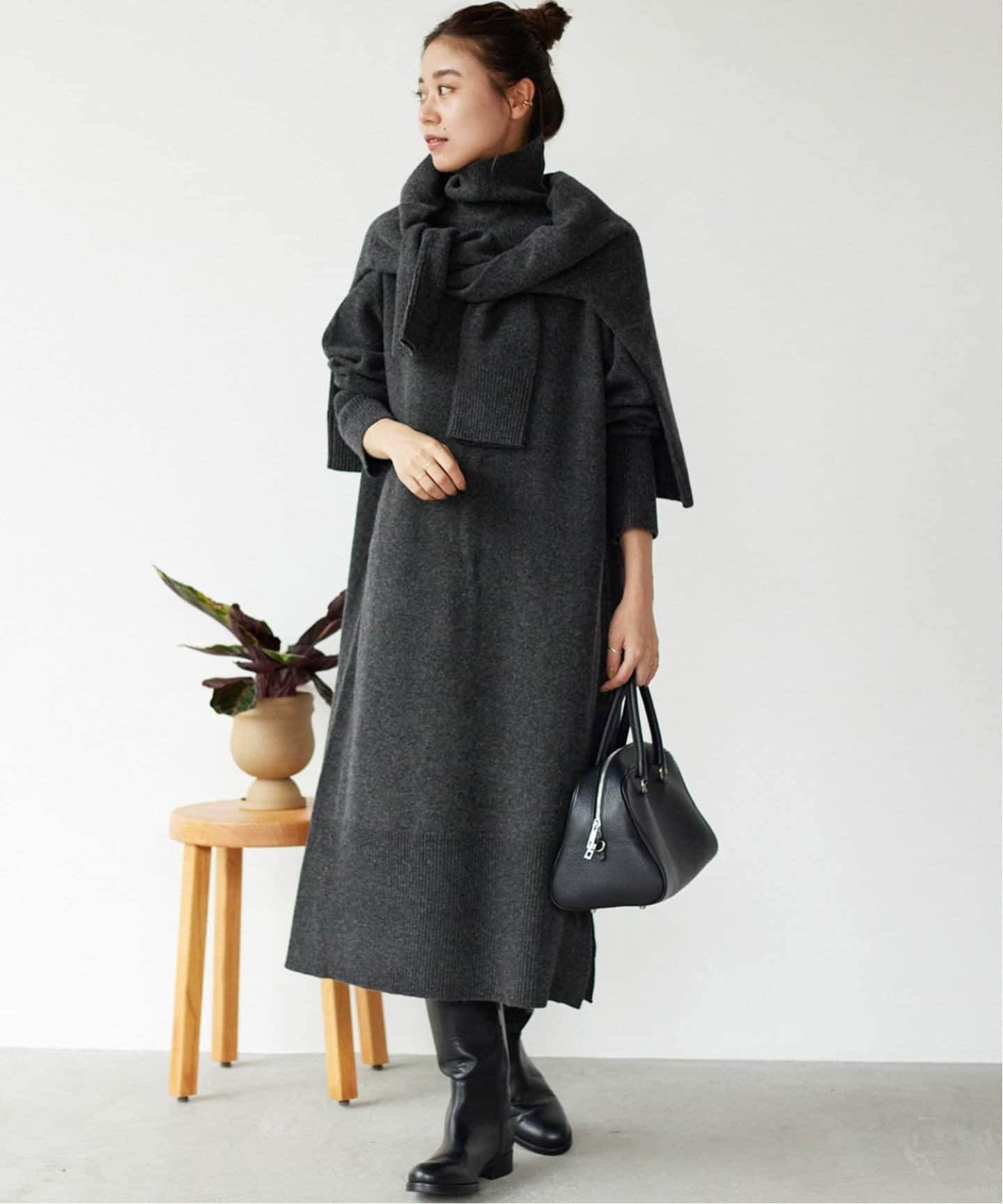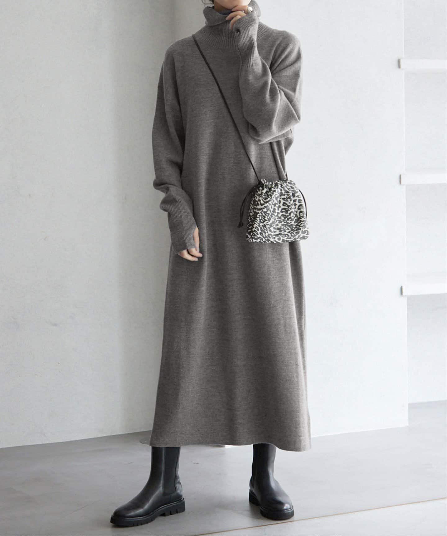 ニットワンピース体のラインを拾わないゆるニットワンピースは、悩まずコーデが完成するお助けアイテム。ゴツめのサイドゴアやロングのブーツをつなぐのが今年っぽい。