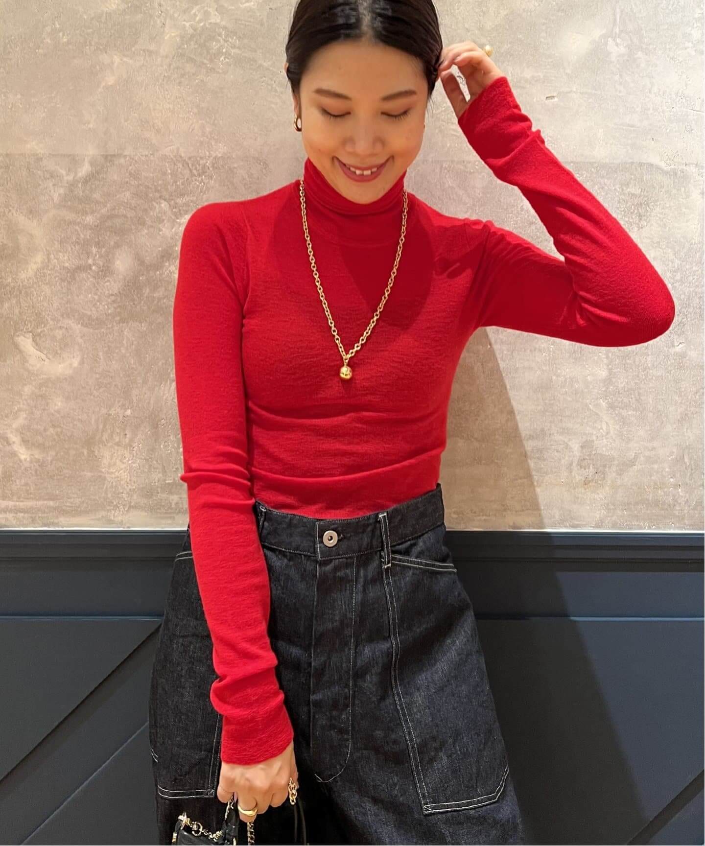 コーデをブラッシュアップコートスタイルの首元にあるとないとで差がつくのがカラータートル。トレンドのレッドやブルーなど、差し色で取り入れてお洒落感度を高めて。