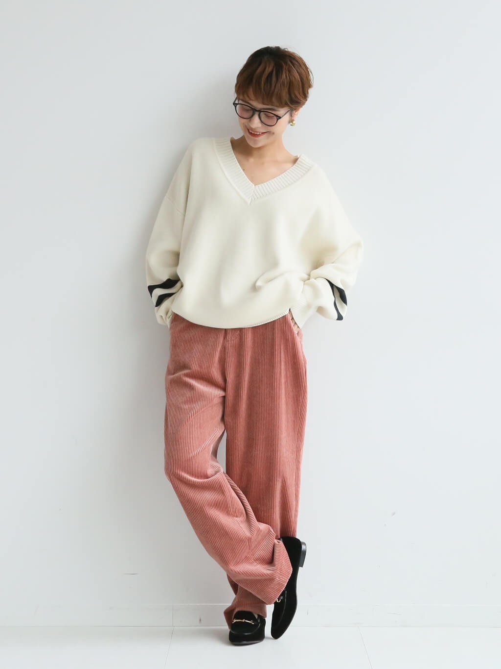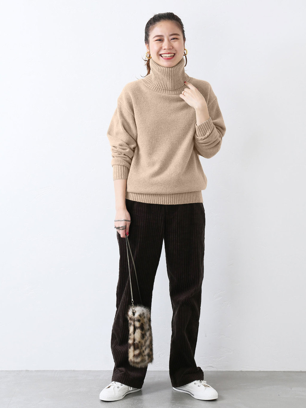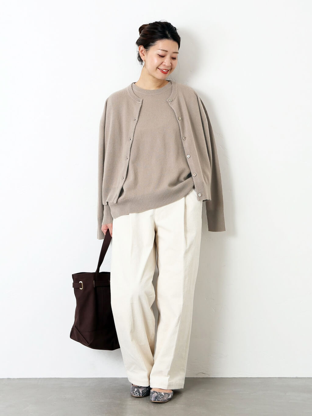 コーデュロイのパンツにはカシミヤのアンサンブルなど、