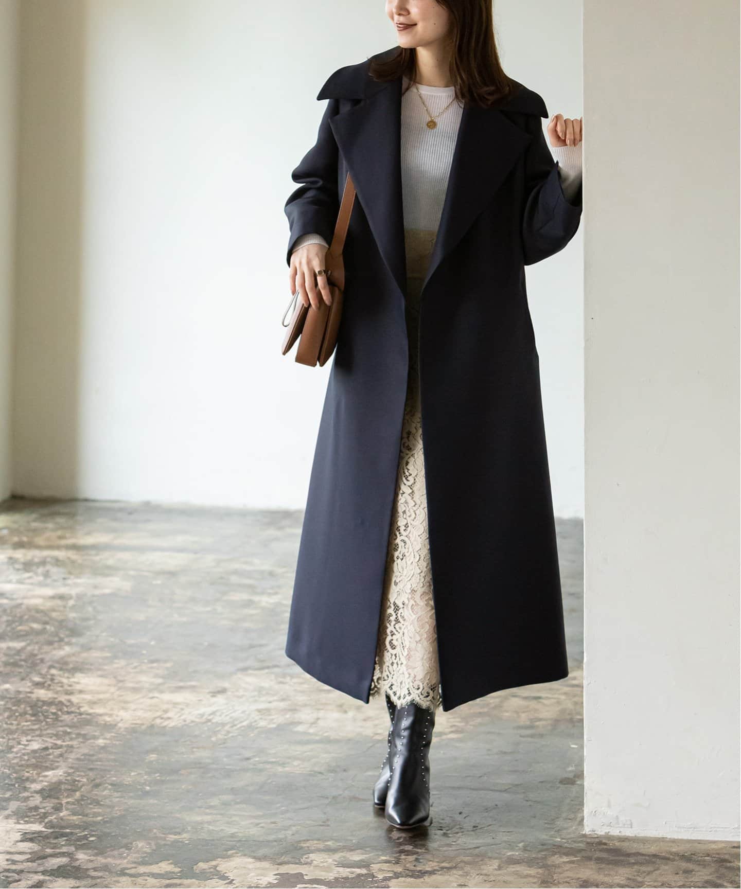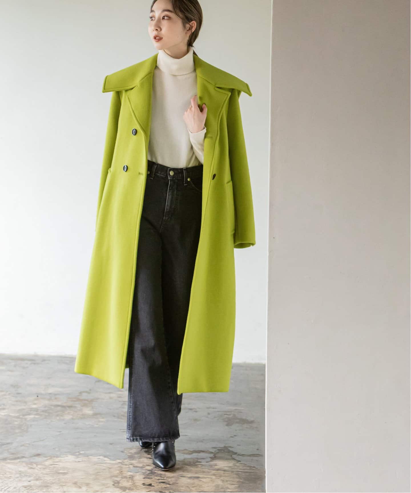 アイキャッチなビッグラペルアウター着映えて小顔効果ももたらす大きなラペルのロングコートが続々。モダンなブラウンの大襟Pコートや、上質素材にネオングリーンをのせたお洒落な一着も。