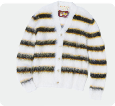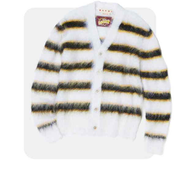 目を惹くボーダー柄がインパクト抜群のちょっとリッチなカーディガン。ふわふわ素材で癒されること間違いナシ。