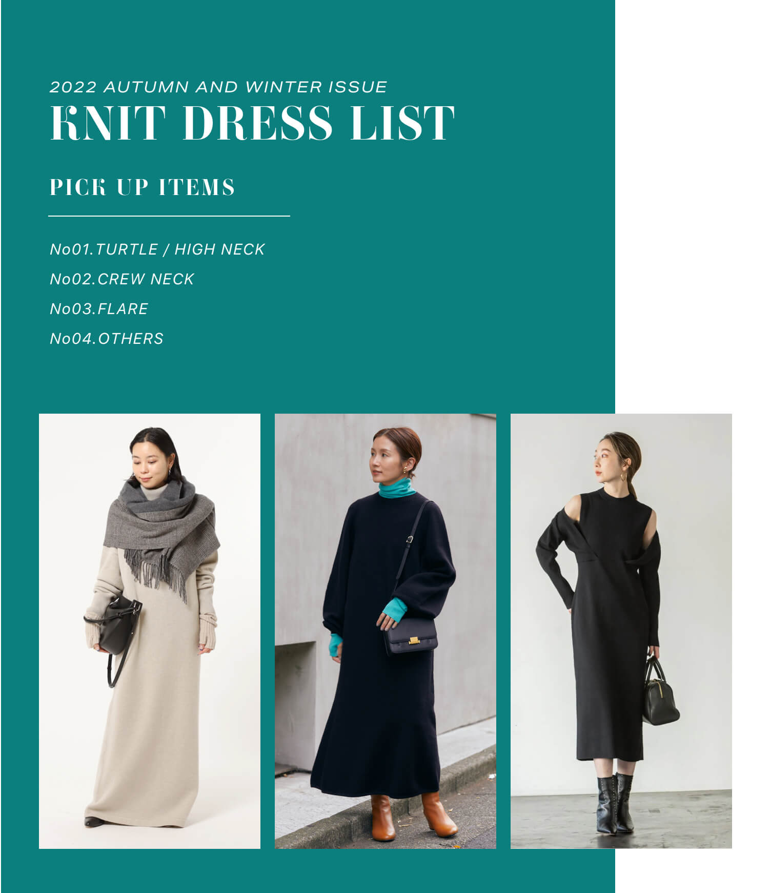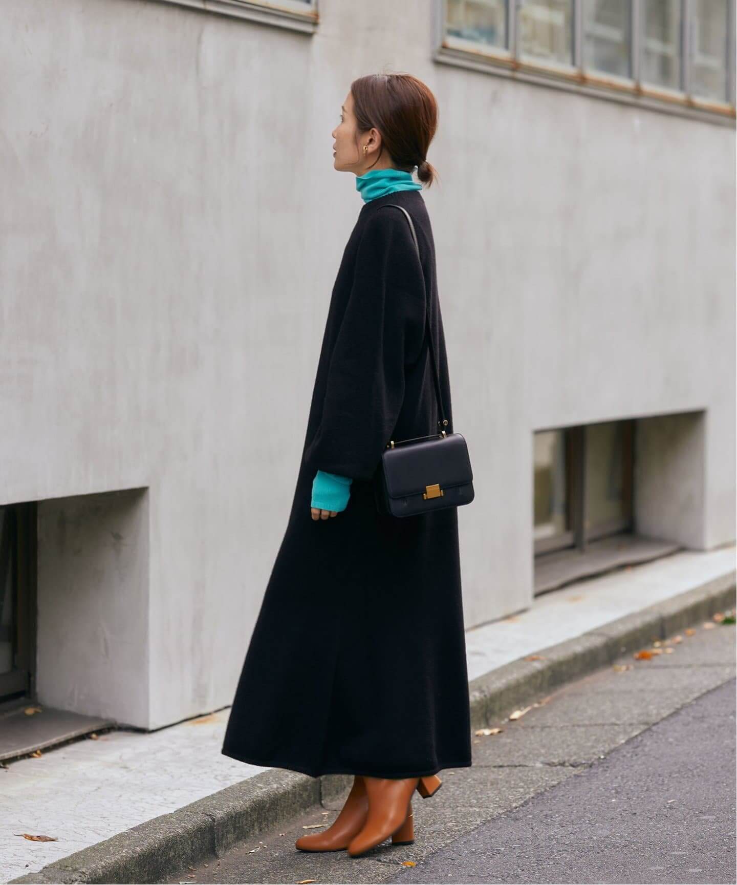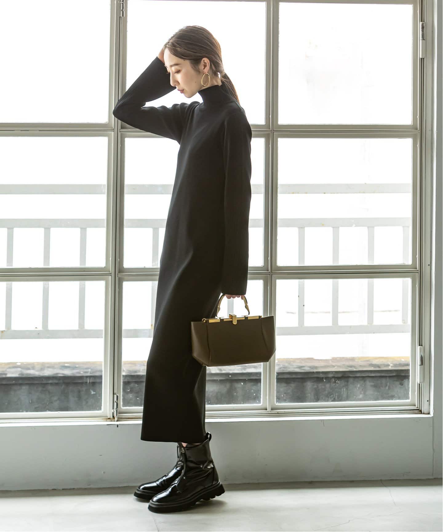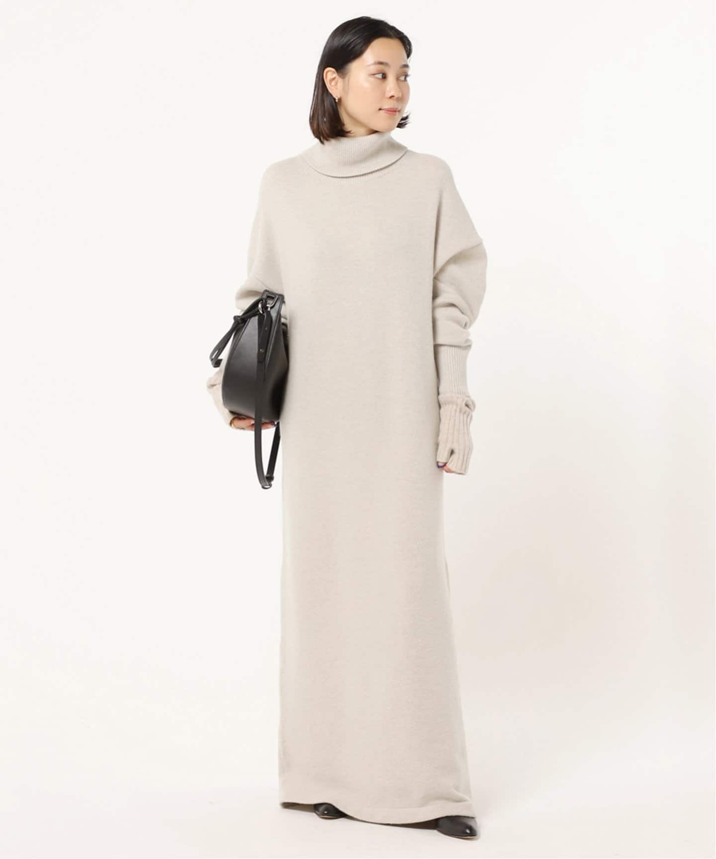 最新タートルネックワンピースニットワンピースはストンと落ち感のあるボクシーなシルエットがトレンド。首元にニュアンスを生むタートルネックは折り返さずに着るのが今年っぽい。