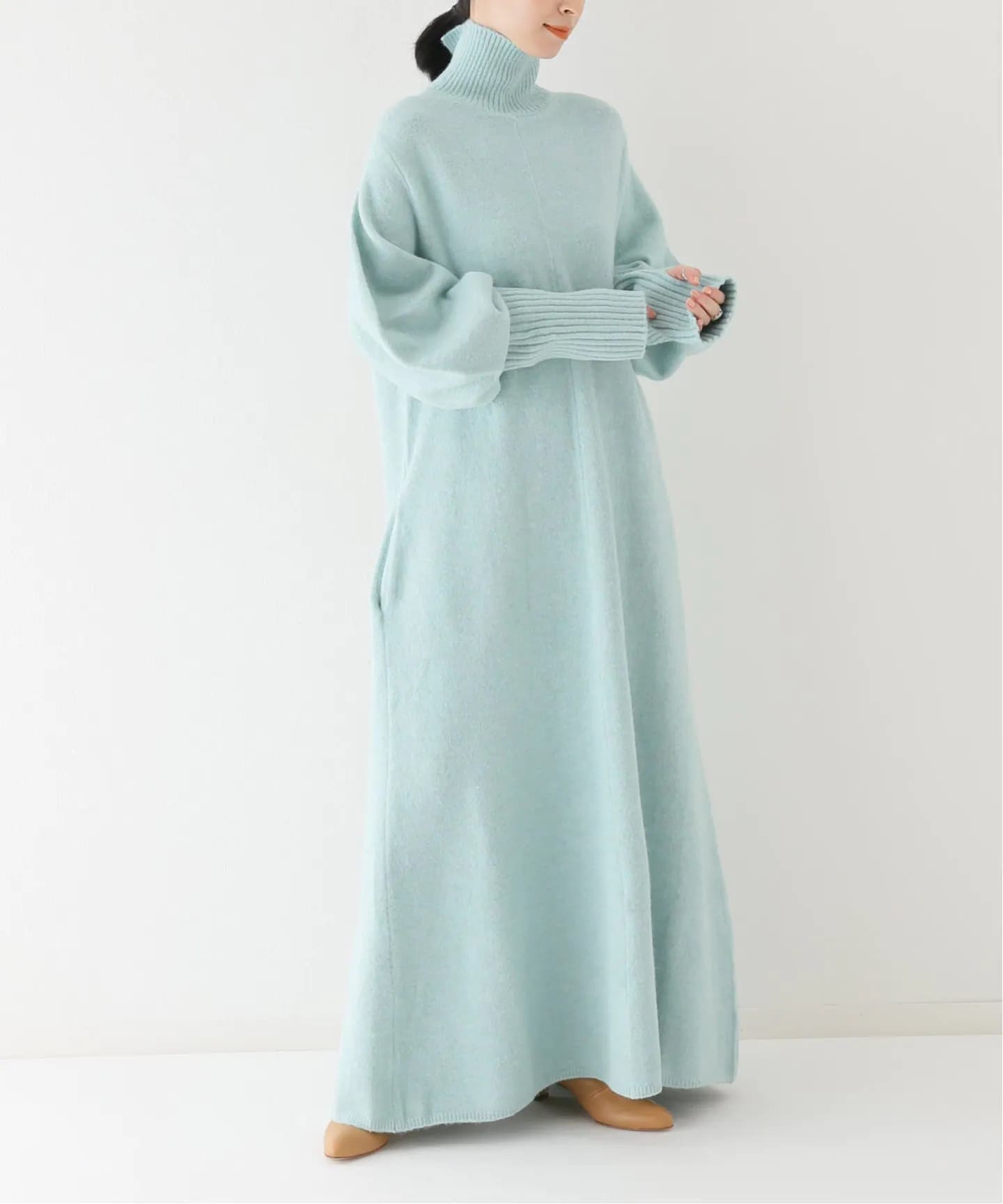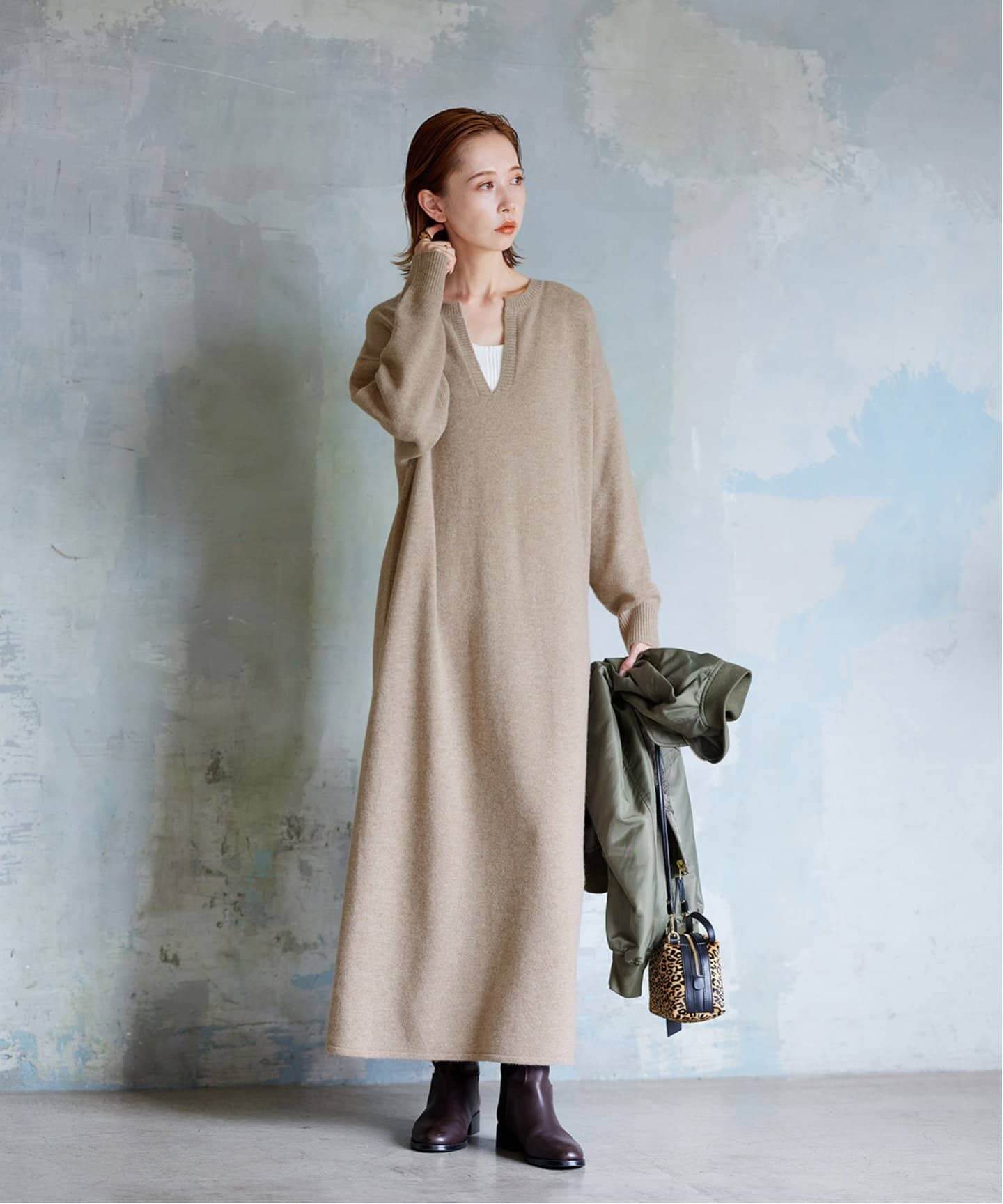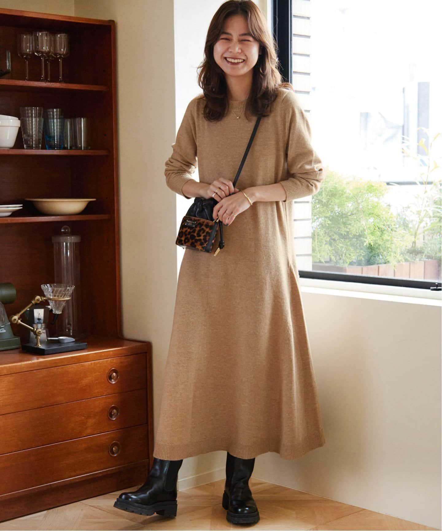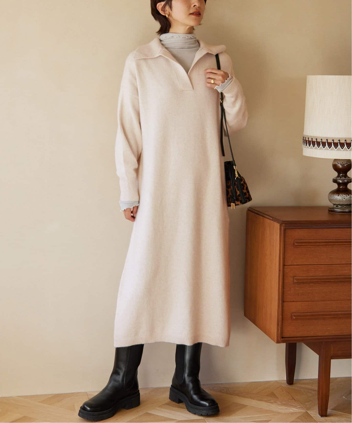 最新タートルネックワンピースニットワンピースはストンと落ち感のあるボクシーなシルエットがトレンド。首元にニュアンスを生むタートルネックは折り返さずに着るのが今年っぽい。