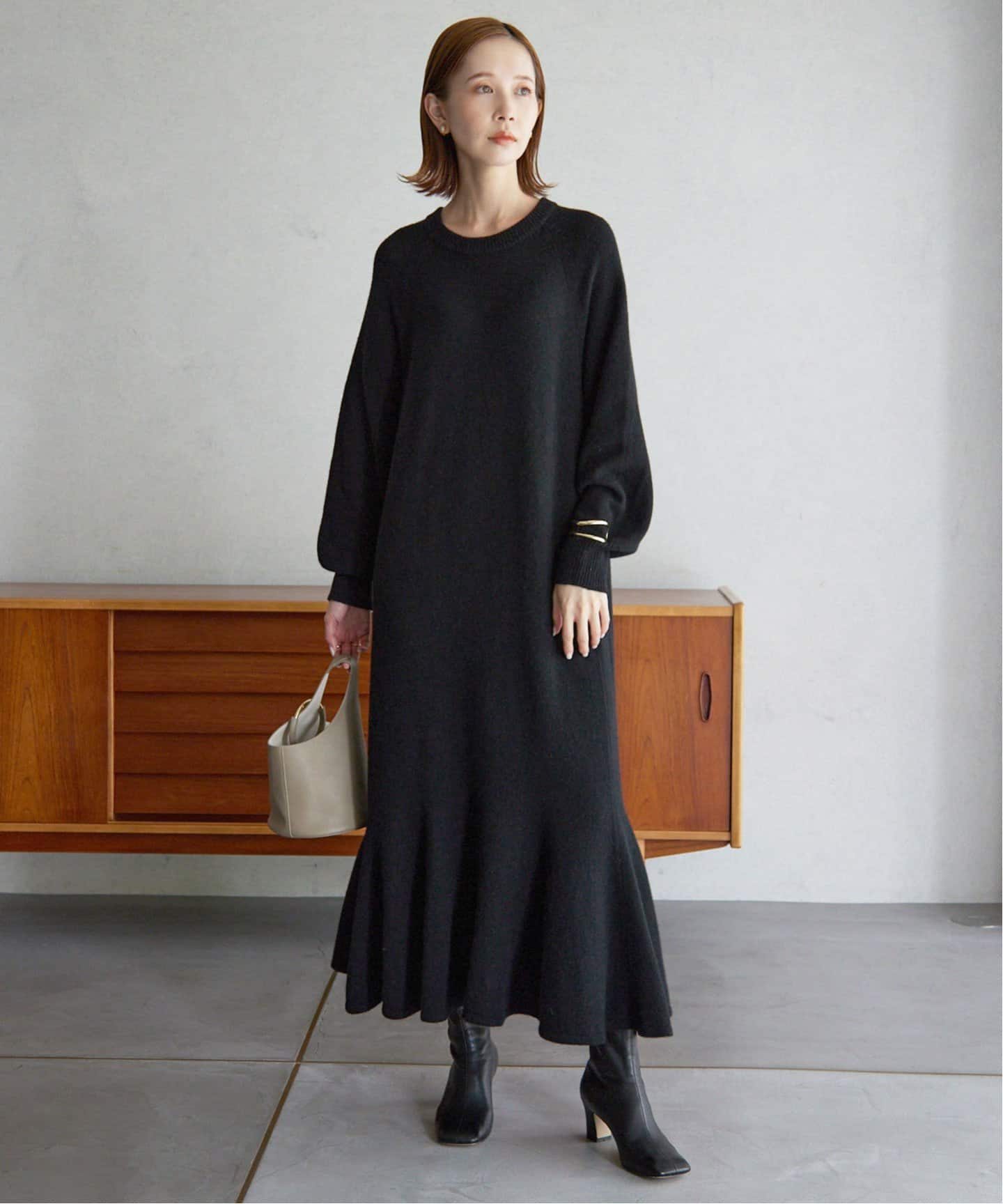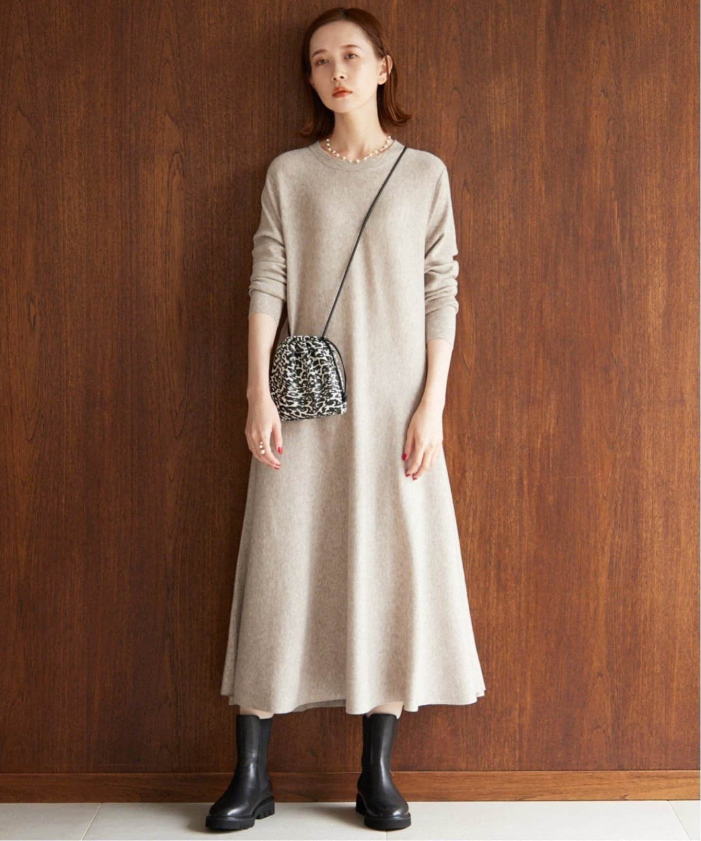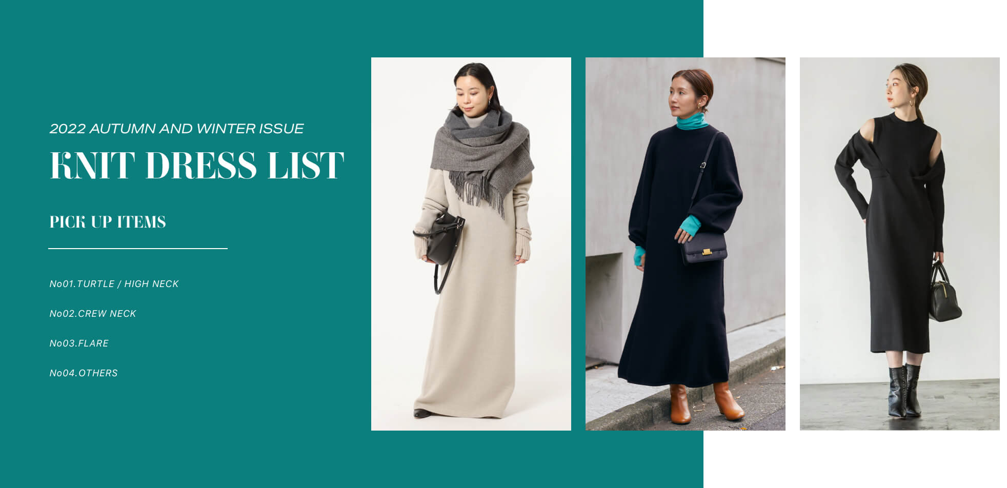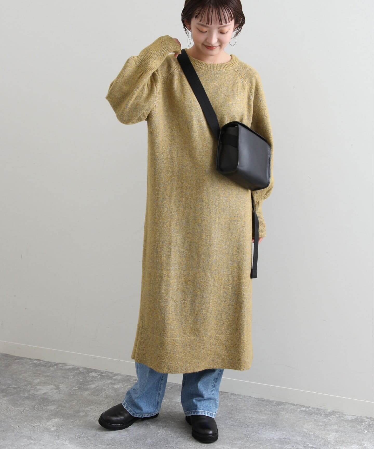 最新タートルネックワンピースニットワンピースはストンと落ち感のあるボクシーなシルエットがトレンド。首元にニュアンスを生むタートルネックは折り返さずに着るのが今年っぽい。