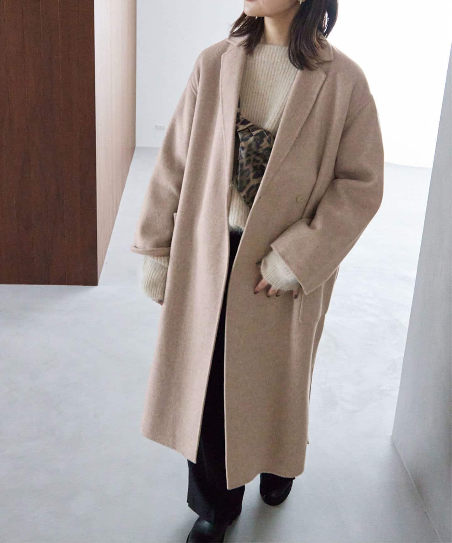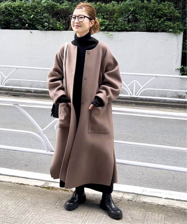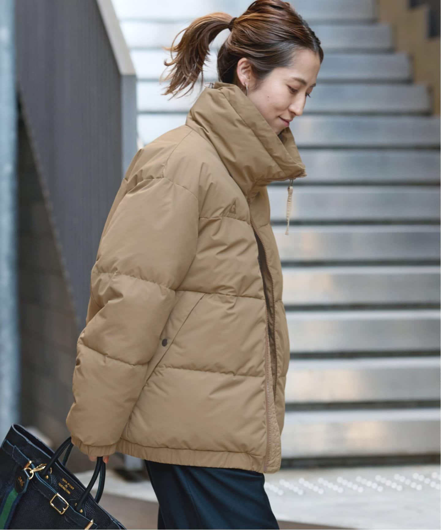 カジュアルアウターも上品にブラッシュアップしなやかで柔らかいベージュなら、ボリューミーなダウンも上品コーデと好相性。スタンドカラーのロングコートはハンサムな雰囲気が加わって◎。