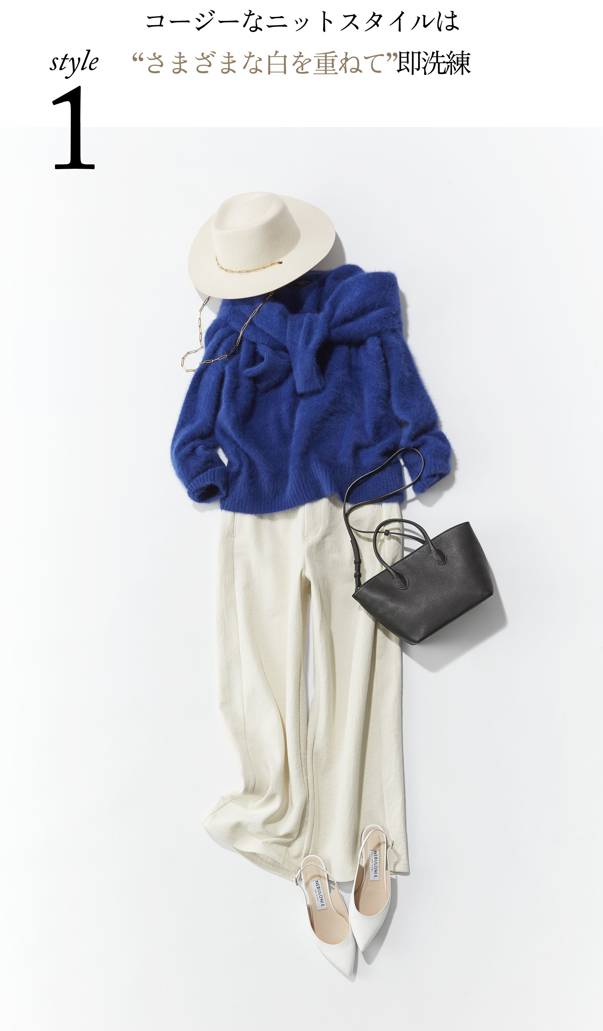 パンツのマットな白、ハットの起毛感のある白、靴の光沢のある白と、同じ白でも異なる質感を重ねることで表情豊かになり、パリの人のようなシンプルだけど印象的な着こなしに仕上がります」。