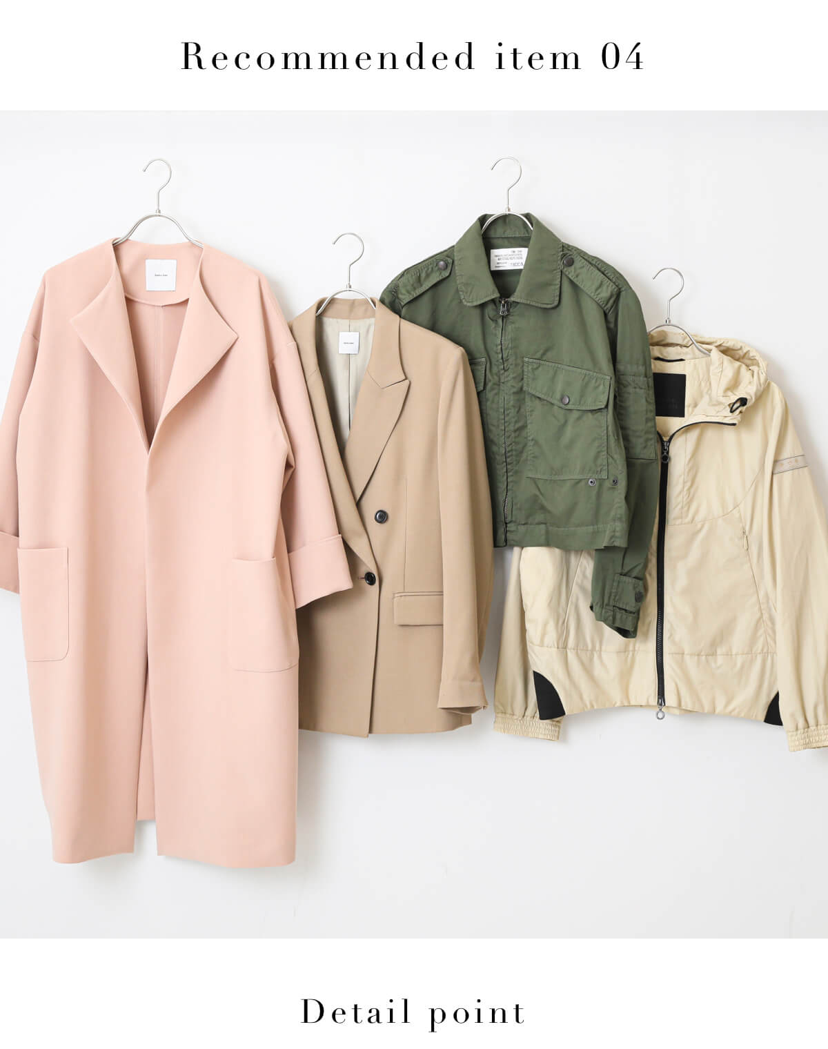 カーキやナチュラルのブルゾンでミリタリーテイストのかっこいい印象にも、また優しい色味のピンクやベージュならかっちりした大人コートも今っぽくハマります。テラコッタの深い色味でかっこいいコーデを連想しがちですが、デザインの組み合わせや抜け感のディテールで遊びながら、好きなテイストに寄せることも可能です。