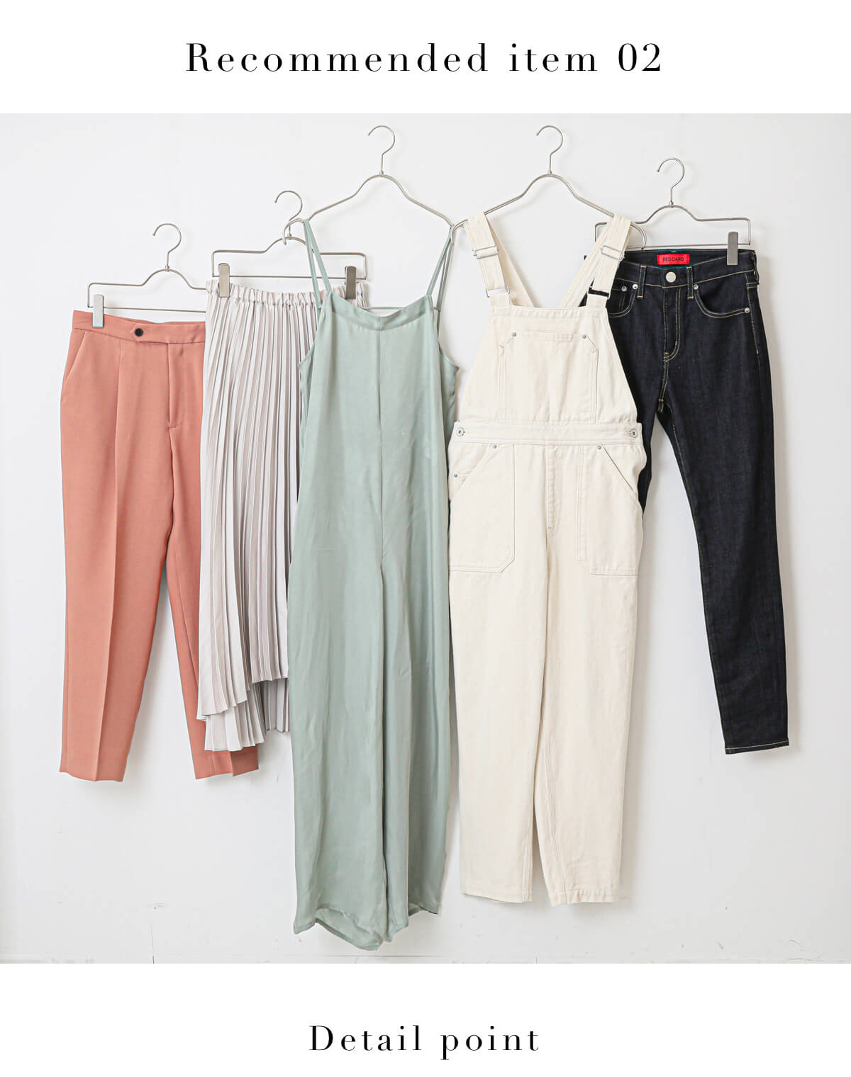 デニムなら黄みがかったナチュラルカラーやブルーブラックがイチオシ。ナチュラルカラーのオーバーオールは大人な小物とコーデしたい。こっくりした深い色味が多い中でも、サーモンピンクやマスカットグリーンは優しい印象もあり、大人女性におすすめしたいアイテムです。落ち感のある素材のセンタープリーツパンツでシックにまとめて。