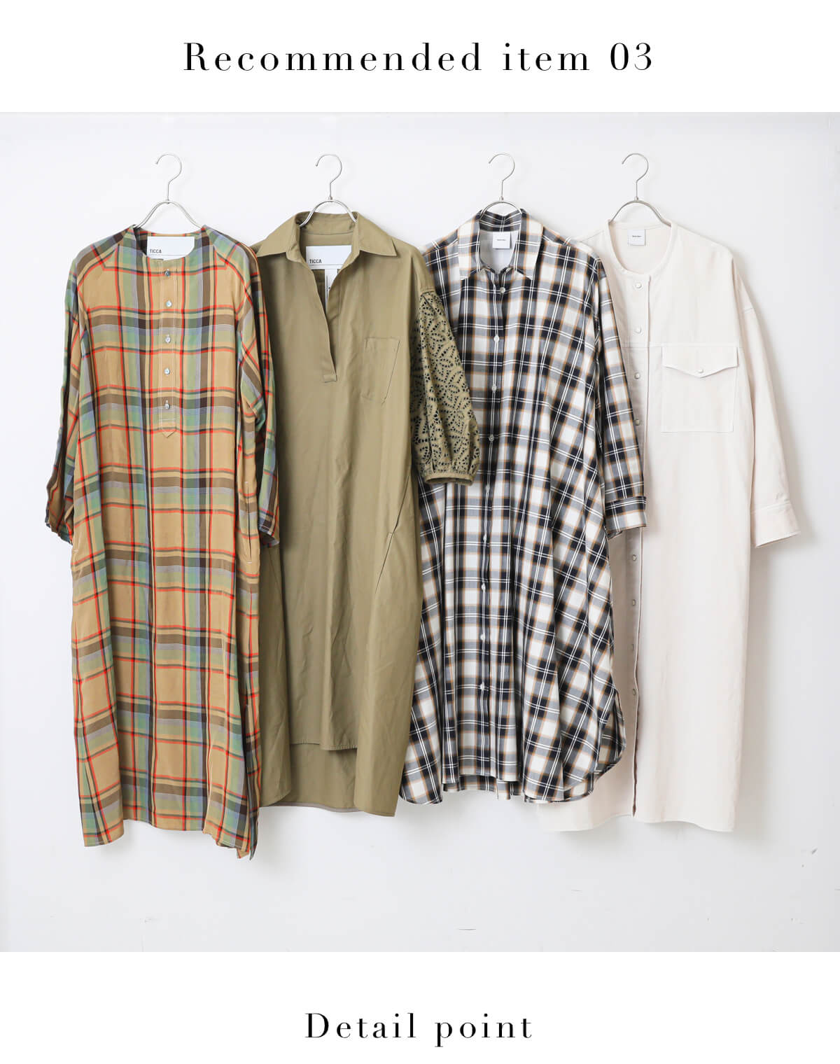 アーバンライクな色使いが印象的なオータムさんのワンピース。カーキやナチュラルなど得意なカラーはもちろん、多色使いのチェックシャツもオータムさんに似合う色味ばかりが使われたワンピースを選びました。コットンピケのシャツワンピースは、すっきりしたノーカラーやサイドに深めに入ったスリットなど、ディテールにこだわり着るだけで様になる1枚です。