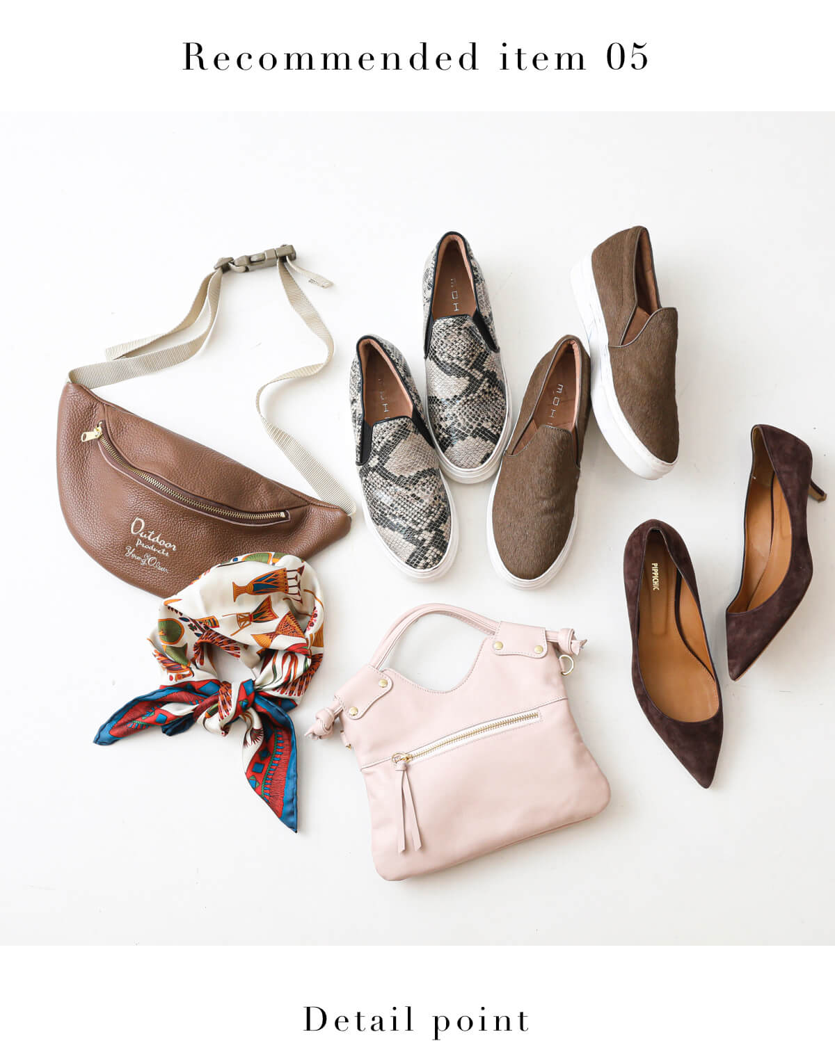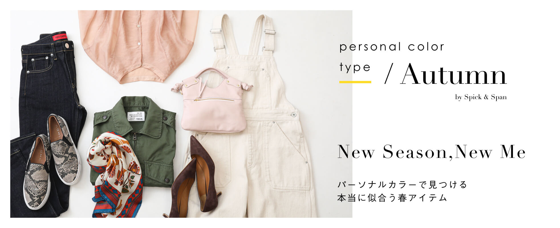 小物は暖色系でまとめて女性らしいコーディネートに。時にはパイソン柄のスリッポンなどで大人な辛口スパイスを添えてみて。コーデのまとめ役に欠かせないブラウンはマロンやカフェモカのような、深みのある色合いがオータムさんにおすすめ。オレンジがかったカッパーレッドなども女性らしさが出て◎。春らしく上品にスカーフで取り入れてみて。