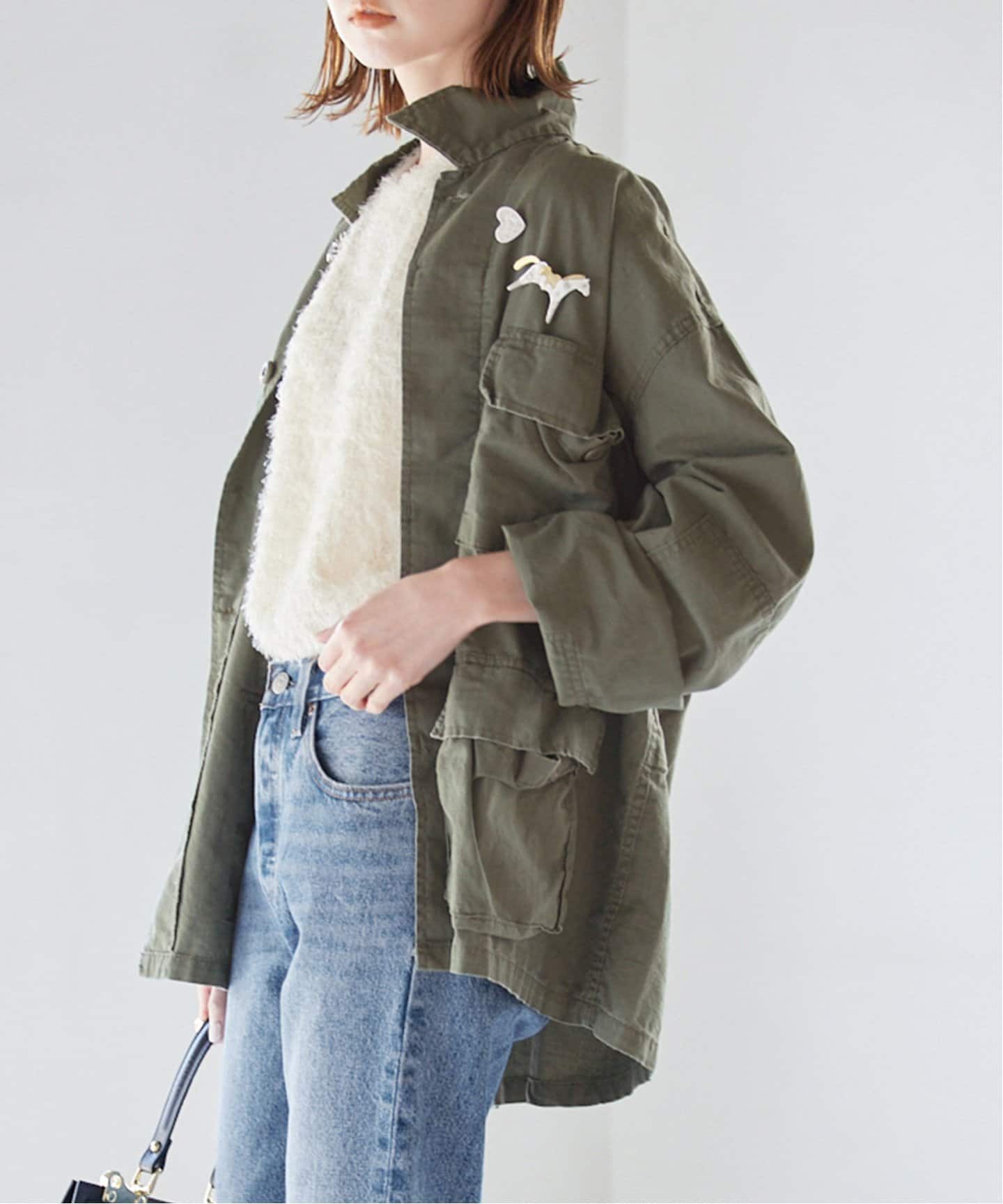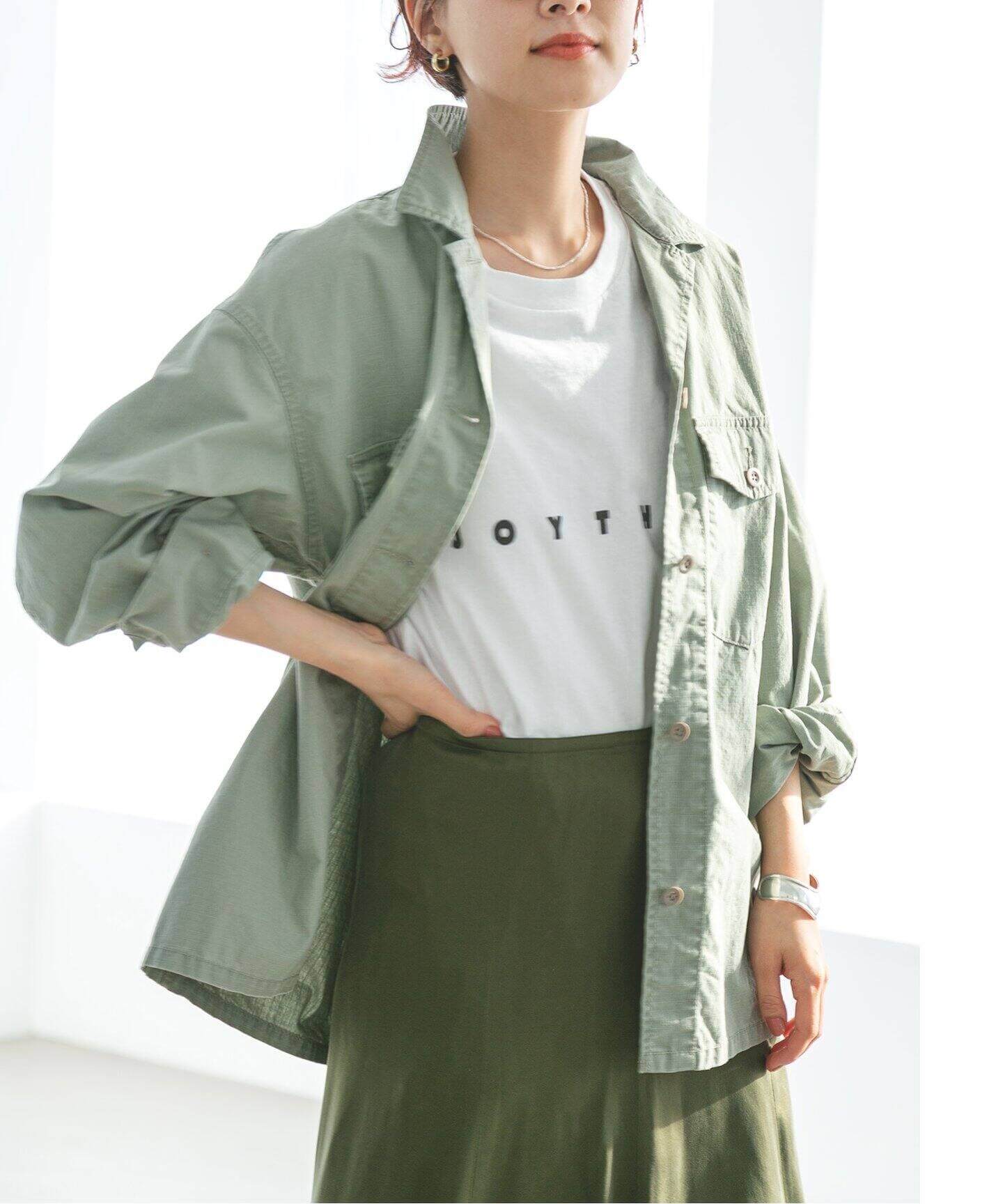 お洒落ムード漂うミリタリーSLOBE IENAの注目は、ミリタリーテイストたっぷりのシャツブルゾン。ヴィンテージ感たっぷりの加工を施すことで、洒落感がアップ。フェミニンなコーデにばさっと羽織って。