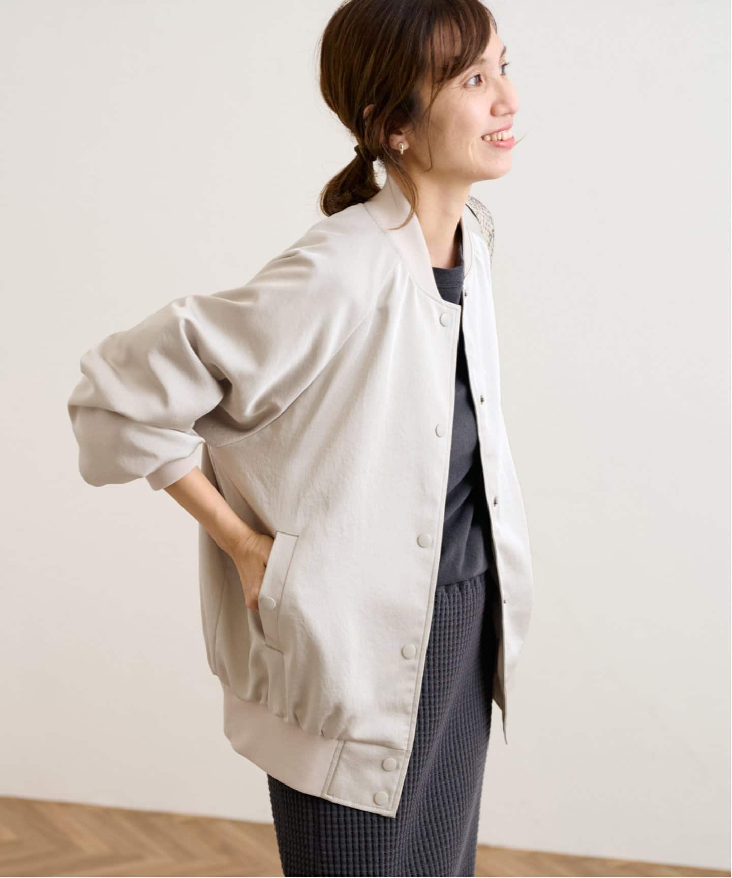 春のお洒落意欲が湧く洗練アウターシンプルコーデに投入するだけでワンランク上の春コーデに導くクロシェジャケット。スポーティーなスタジャンを上品なサテンで仕上げた女っぽアウターも今年っぽい。