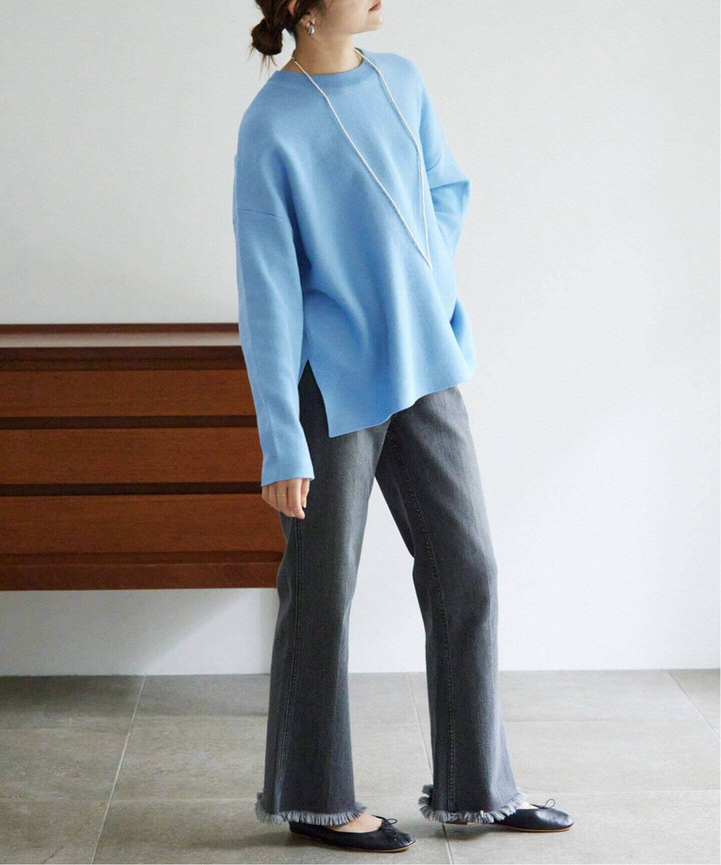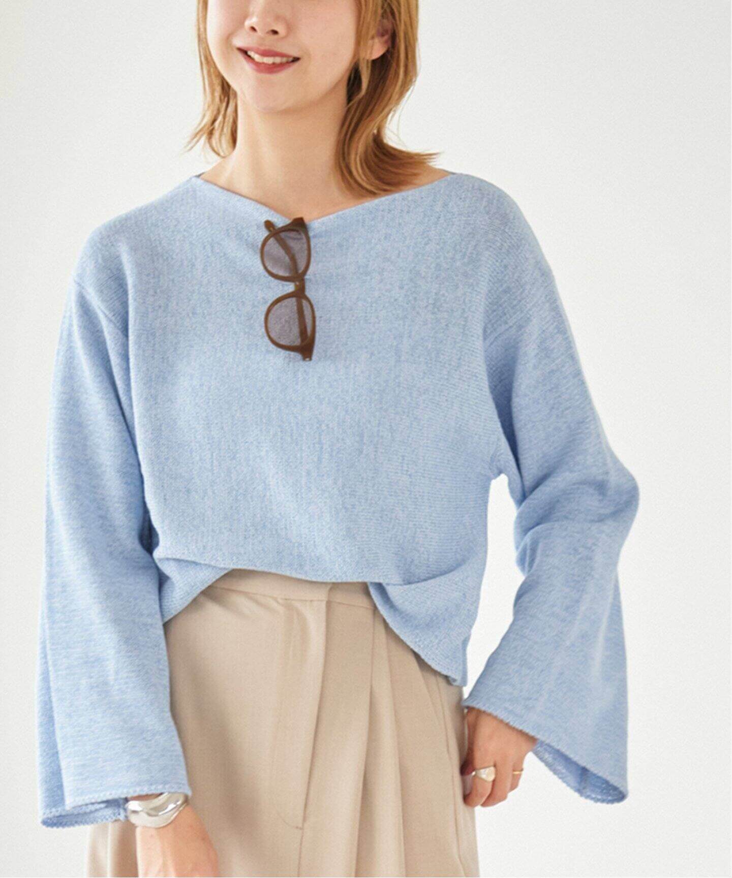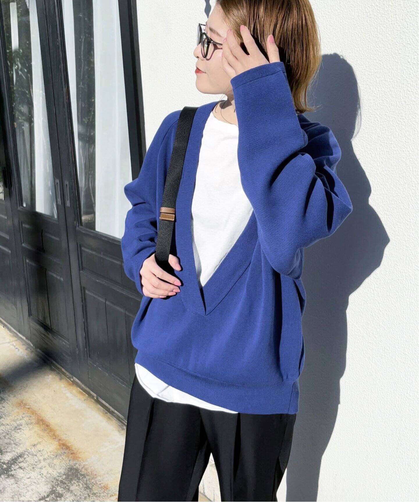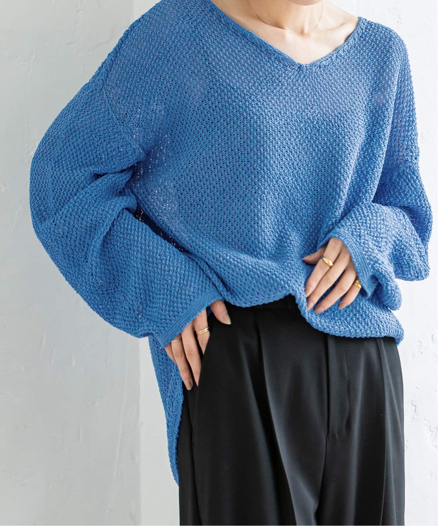 この春のおすすめブルーはサックス。シンプルなクルーネックニットでも爽やかな大人コーデが簡単に。表情のある編み地のVネックニットで抜け感を加えてもOK。