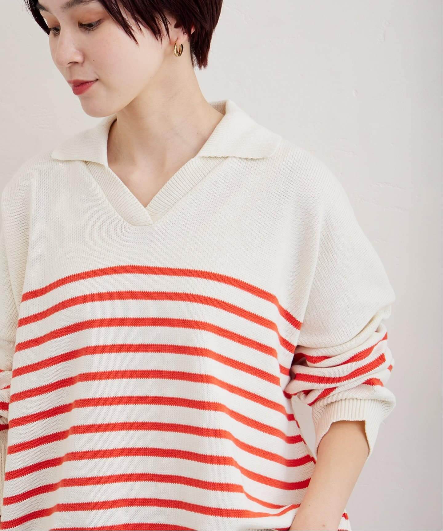 レッド×ホワイトのボーダー&スキッパーポロのシルエットが新鮮なTRICOTS JEANMARCなど、一点投入で映えるカラーニットがこの春頼りになりそう。