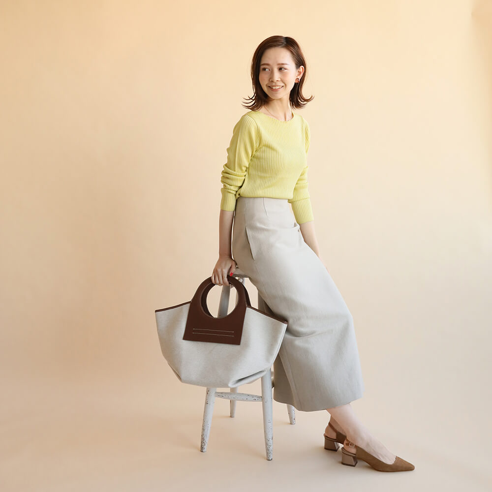 バッグもニュアンスグレーで全体を引き締めつつもバランスよく。