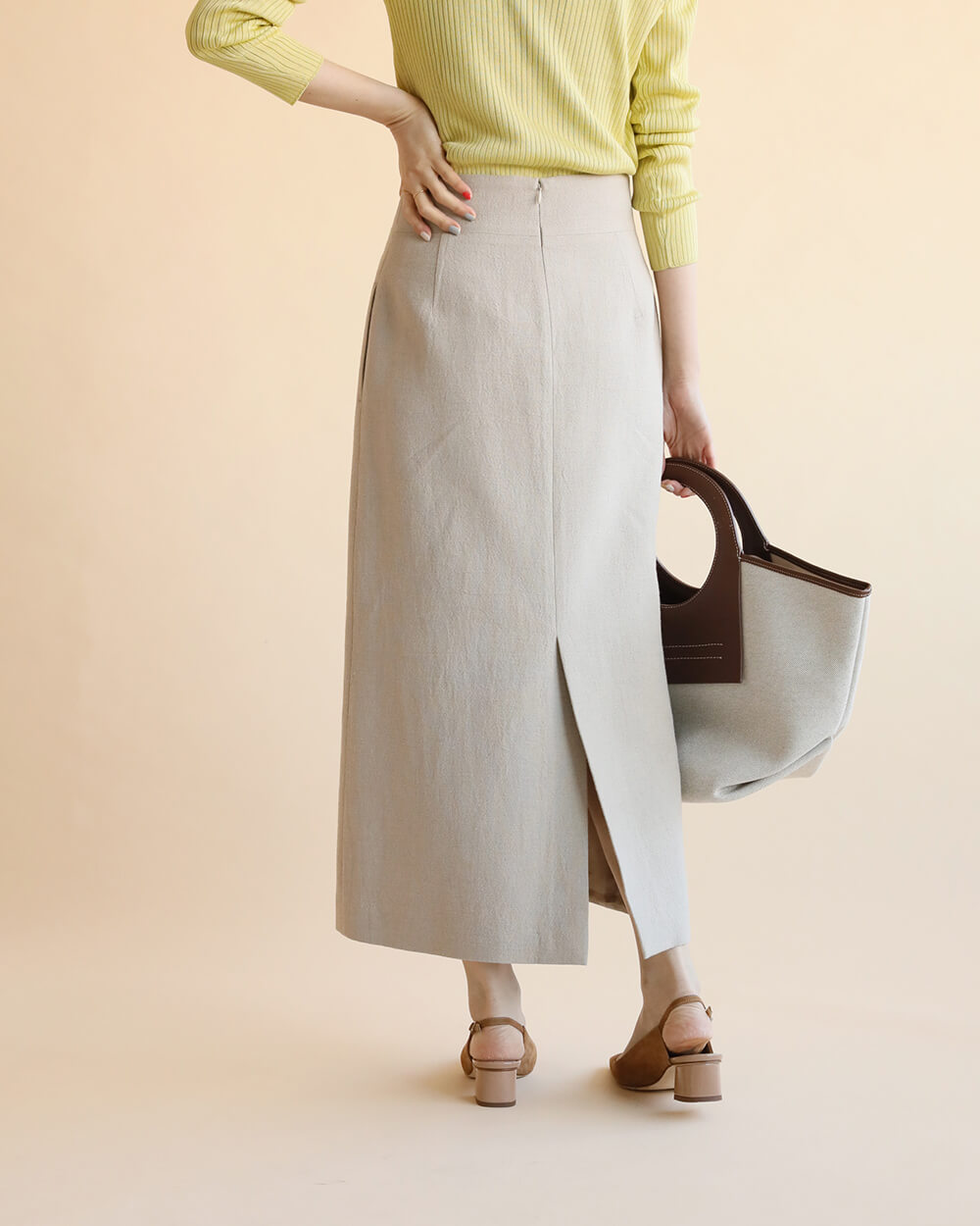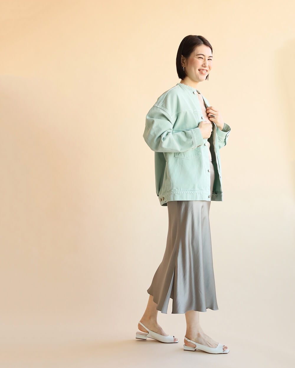 上品さのあるサテンスカートで異素材ミックスを楽しんで。