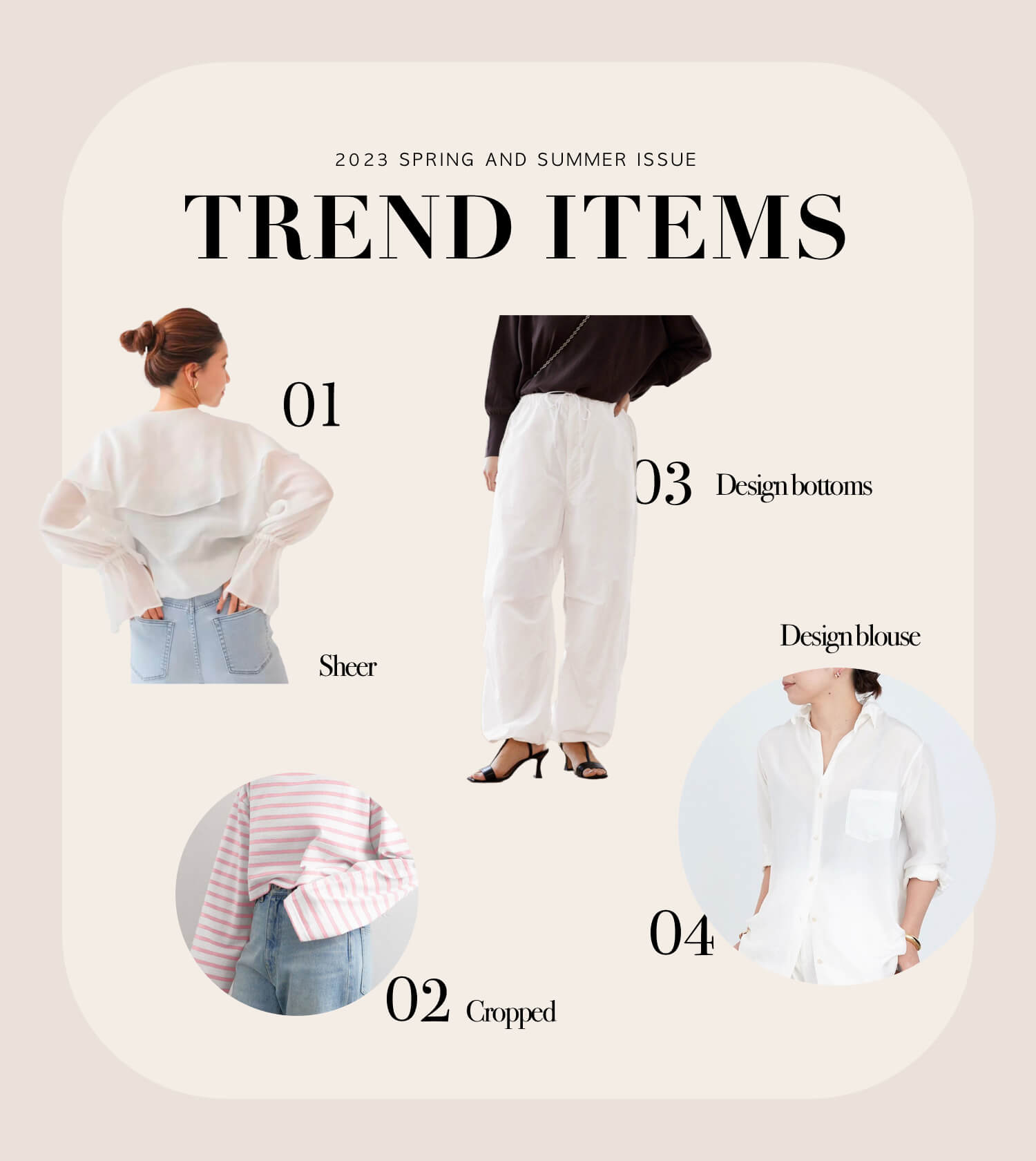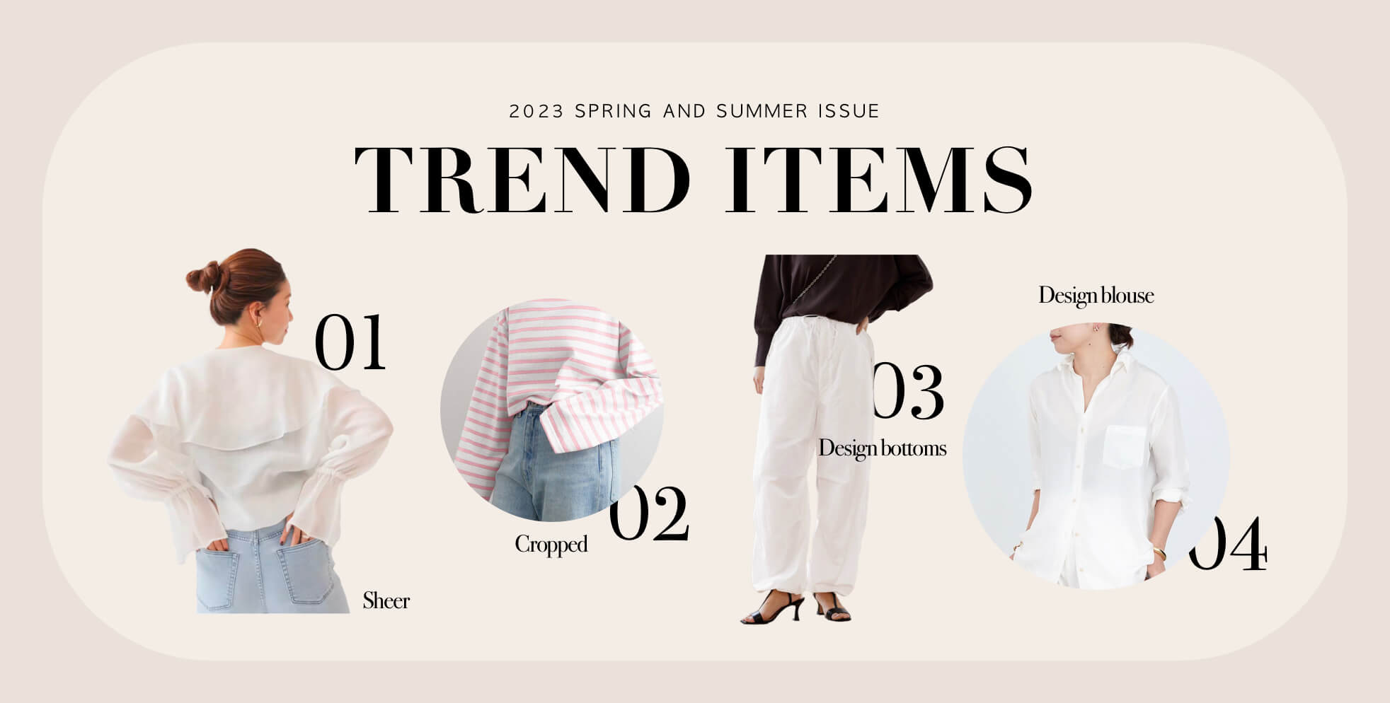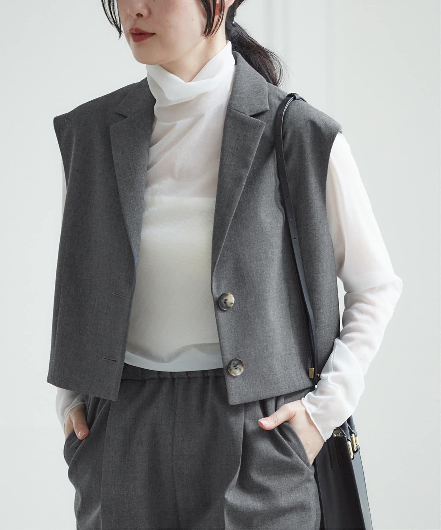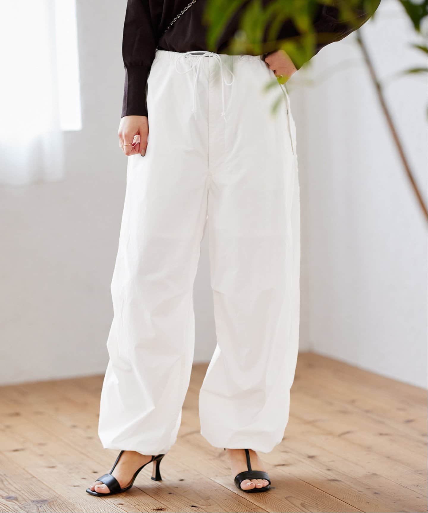 定番コーデの鮮度を更新シルエットが注目なのが丈の短いクロップドトップス。タックワイドパンツやハイウエストのボトムスと相性が良く、今どきなスタイルバランスにアップデート。