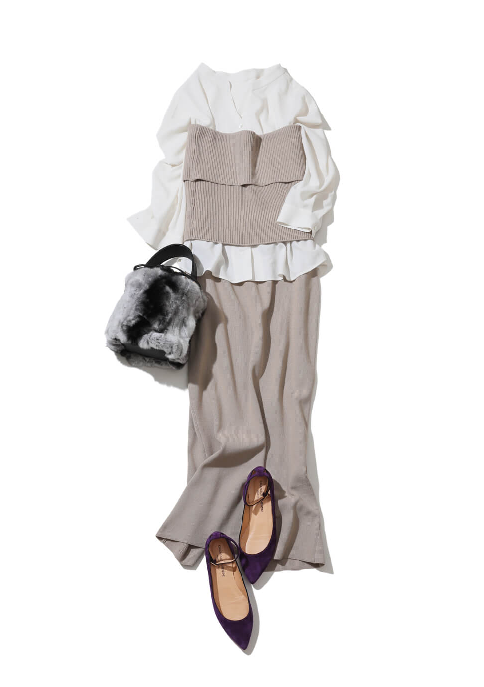 ファッションの秋、いつもと違う新しいアイテムに挑戦するなたビスチェがオススメ。シンプルな白シャツに重ねるだけで、一気にモードが加速。トライしやすいカラーはベージュ。ボトムスも色を合わせれば、より合わせやすくなります。モコモコバッグとポインテッドパンプスでアクセントを添えて。 - NOBLEリブニットビスチェ¥9,790(税込)